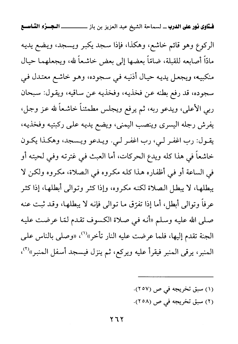 الركوع وهو قائم خاشع، وهكذا، فإذا سجد يكبر ويسجد ويضع يديه مادا أصابعه للقبلة ضاما بعضها إلى بعض خاشعا لله، ويجعلهما حيال منكبيه، ويجعل يديه حيال أذنيه في سجوده، وهو خاشع معتدل في سجوده قد رفع بطنه عن فخذيه وفخذيه عن ساقيه، ويقول: سبحان ربي الأعلى، ويدعو ربه، ثم يرفع ويجلس مطمئنا خاشعا لله عز وجل، يفرش رجله اليسرى وينصب اليمنى، ويضع يديه على ركبتيه وفخذيه، يقول: رب اغفر لي، رب اغفر لي. ويدعو ويسجد، وهكذا يكون خاشعا في هذا كله ويدع الحركات، أما العبث في غترته وفي لحيته أو في الساعة أو في أظفاره هذا كله مكروه في الصلاة، مكروه ولكن لا يبطلها، لا يبطل الصلاة لكنه مكروه، وإذا كثر وتوالى أبطلها، إذا كثر عرفا وتوالى أبطل، أما إذا تفرق ما توالى فإنه لا يبطلها، وقد ثبت عنه - صلى الله عليه وسلم - أنه في صلاة الكسوف تقدم؛ لما عرضت عليه الجنة تقدم إليها، «فلما عرضت عليه النار تأخر (¬1)» وصلى بالناس على المنبر؛ يرقى المنبر فيقرأ عليه ويركع، «ثم ينزل فيسجد أسفل المنبر (¬2)»