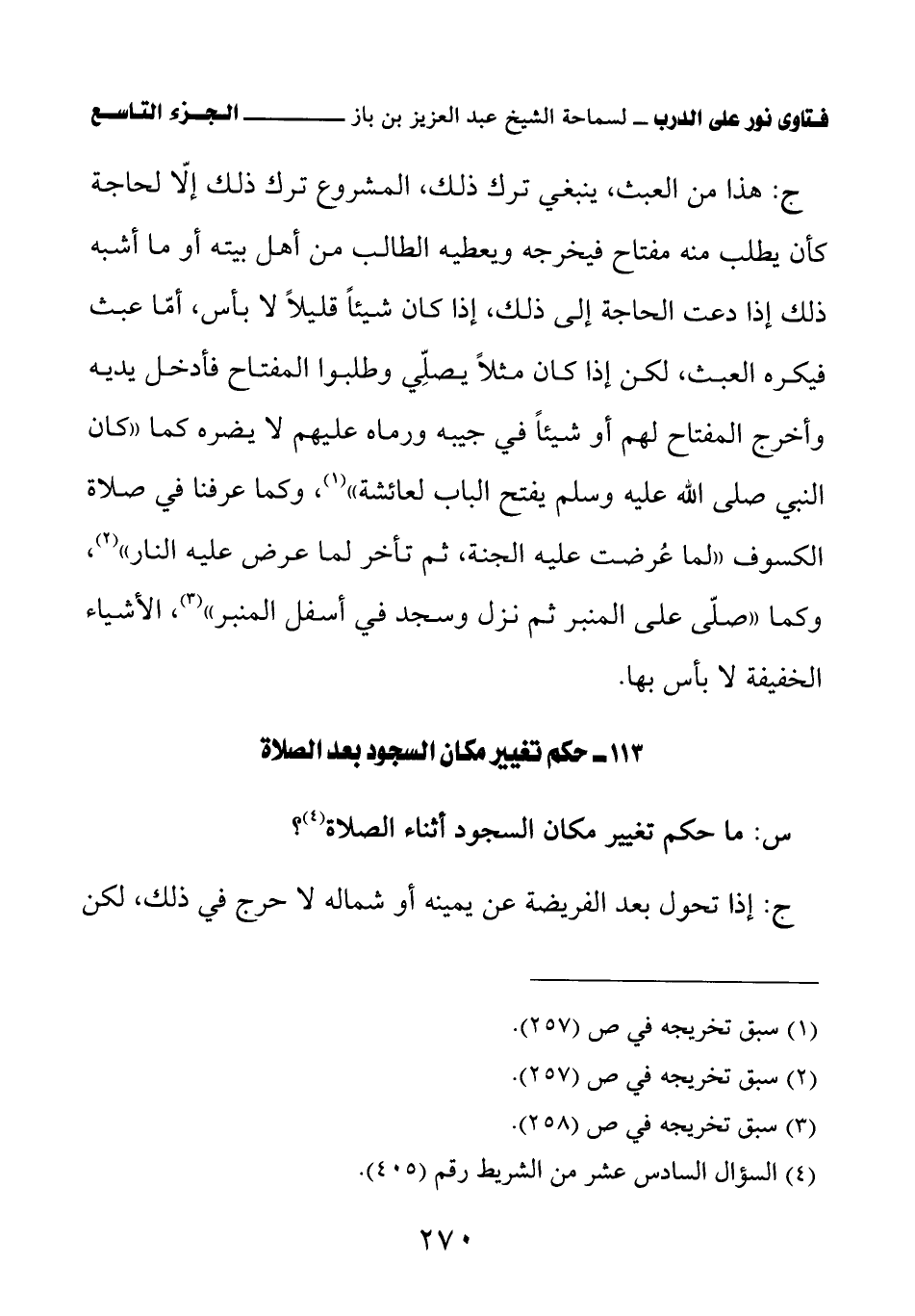 ج: هذا من العبث، ينبغي ترك ذلك، المشروع ترك ذلك إلا لحاجة كأن يطلب منه مفتاح فيخرجه ويعطيه الطالب من أهل بيته أو ما أشبه ذلك إذا دعت الحاجة إلى ذلك، إذا كان شيئا قليلا لا بأس، أما عبث فيكره العبث، لكن إذا كان مثلا يصلي وطلبوا المفتاح فأدخل يديه وأخرج المفتاح لهم أو شيئا في جيبه ورماه عليهم لا يضره كما «كان النبي - صلى الله عليه وسلم - يفتح الباب لعائشة (¬1)» وكما عرفنا في صلاة الكسوف «لما عرضت عليه الجنة ثم تأخر لما عرض عليه النار (¬2)» وكما «صلى على المنبر ثم نزل وسجد في أسفل المنبر (¬3)» الأشياء الخفيفة لا بأس بها.