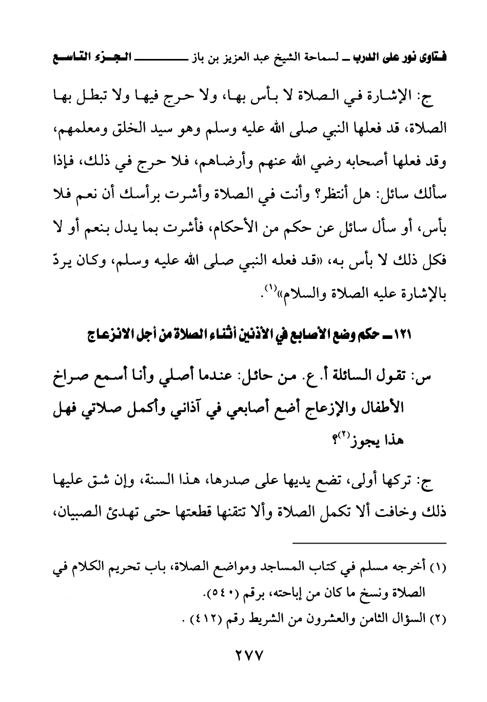 ج: الإشارة في الصلاة لا بأس بها ولا حرج فيها ولا تبطل بها الصلاة، قد فعلها النبي - صلى الله عليه وسلم - وهو سيد الخلق ومعلمهم، وقد فعلها أصحابه رضي الله عنهم وأرضاهم، فلا حرج في ذلك، فإذا سألك سائل: هل أنتظر؟ وأنت في الصلاة وأشرت برأسك أن نعم فلا بأس، أو سأل سائل عن حكم من الأحكام فأشرت بما يدل بنعم أو لا فكل ذلك لا بأس به، قد فعله النبي - صلى الله عليه وسلم - «وكان يرد بالإشارة عليه الصلاة والسلام (¬1)»