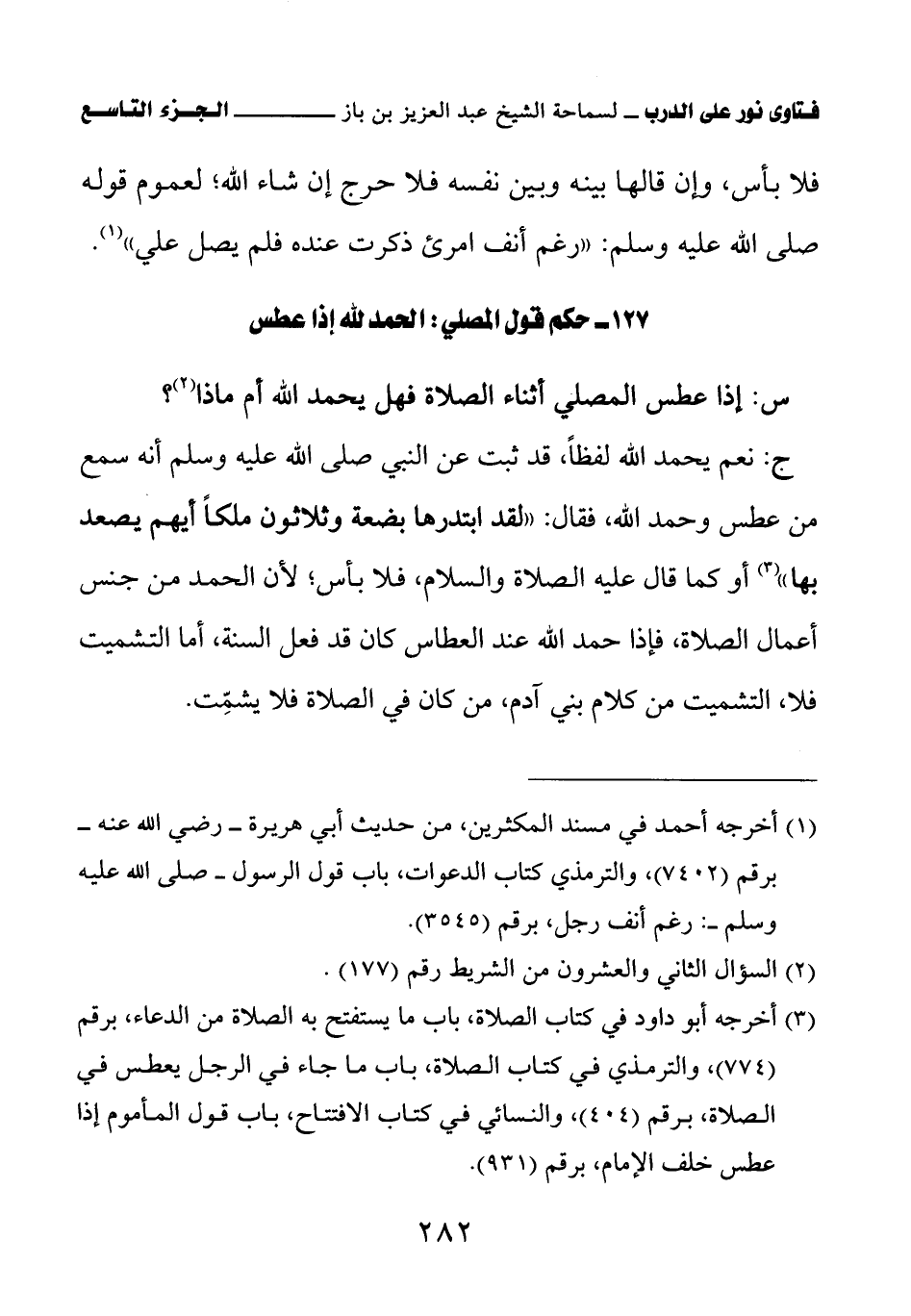 127 - حكم قول المصلي “ الحمد لله “ إذا عطس