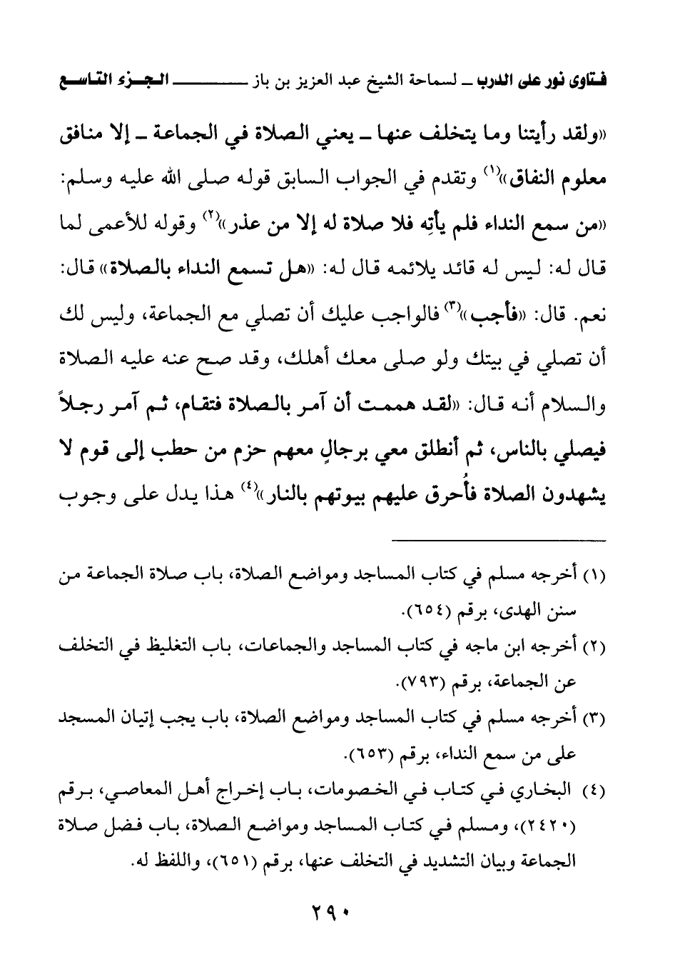 «ولقد رأيتنا وما يتخلف عنها - يعني الصلاة في الجماعة - إلا منافق معلوم النفاق (¬1)» وتقدم في الجواب السابق قوله صلى الله عليه وسلم: «من سمع النداء فلم يأته فلا صلاة له إلا من عذر (¬2)» وقوله للأعمى لما قال له: ليس له قائد يلائمه، قال له: «هل تسمع النداء بالصلاة؟ قال: نعم. قال: فأجب (¬3)» فالواجب عليك أن تصلي مع الجماعة وليس لك أن تصلي في بيتك ولو صلى معك أهلك، وقد صح عنه عليه الصلاة والسلام أنه قال: «لقد هممت أن آمر بالصلاة فتقام، ثم آمر رجلا فيصلي بالناس، ثم أنطلق معي برجال معهم حزم من حطب إلى قوم لا يشهدون الصلاة فأحرق عليهم بيوتهم بالنار (¬4)» هذا يدل على وجوب