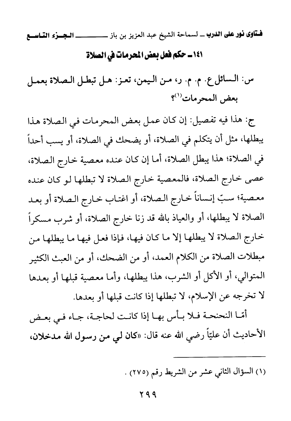 س: السائل ع. م. م. ر من اليمن، تعز: هل تبطل الصلاة بعمل بعض المحرمات (¬1)؟