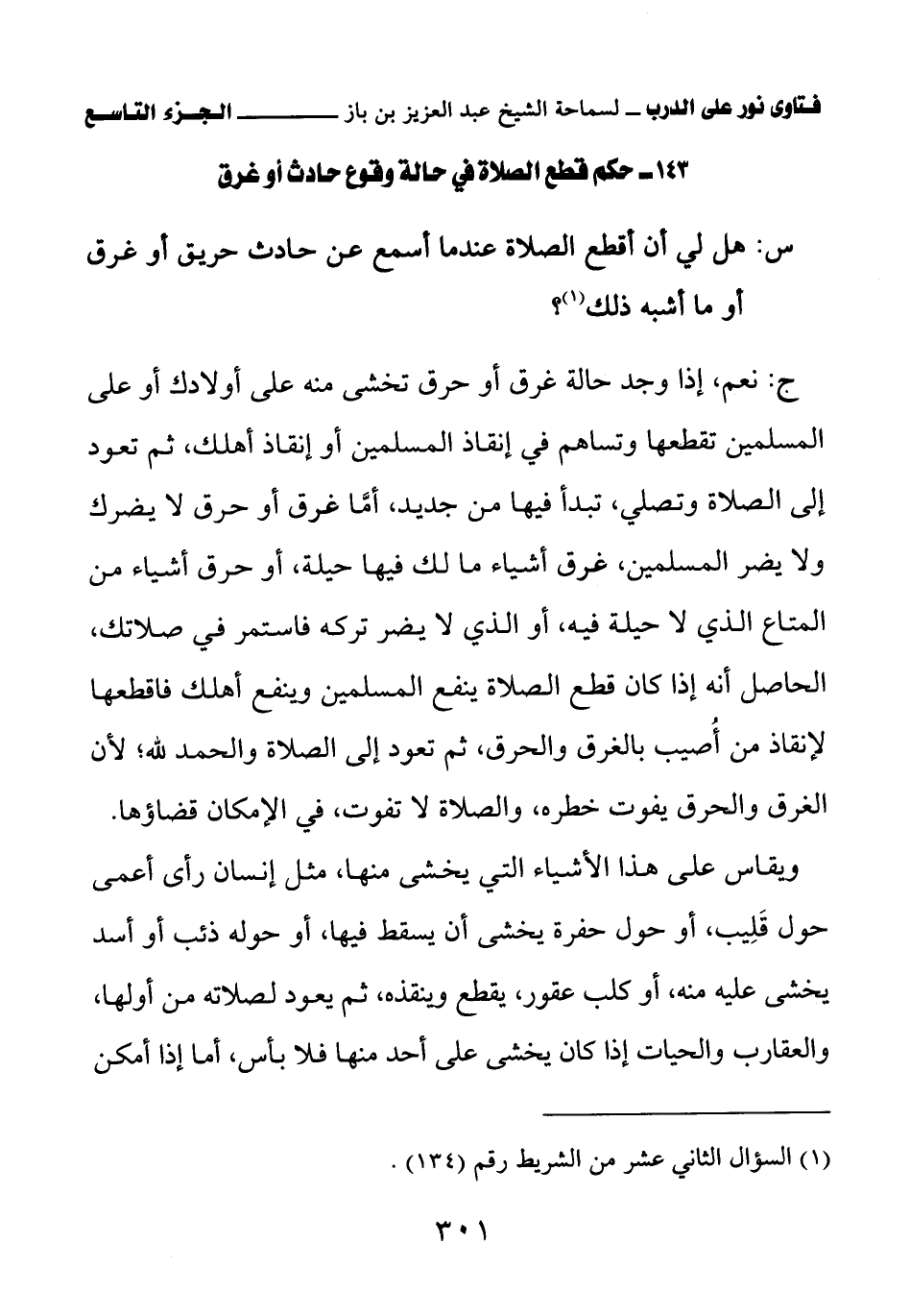 143 - حكم قطع الصلاة في حالة وقوع حادث أو غرق