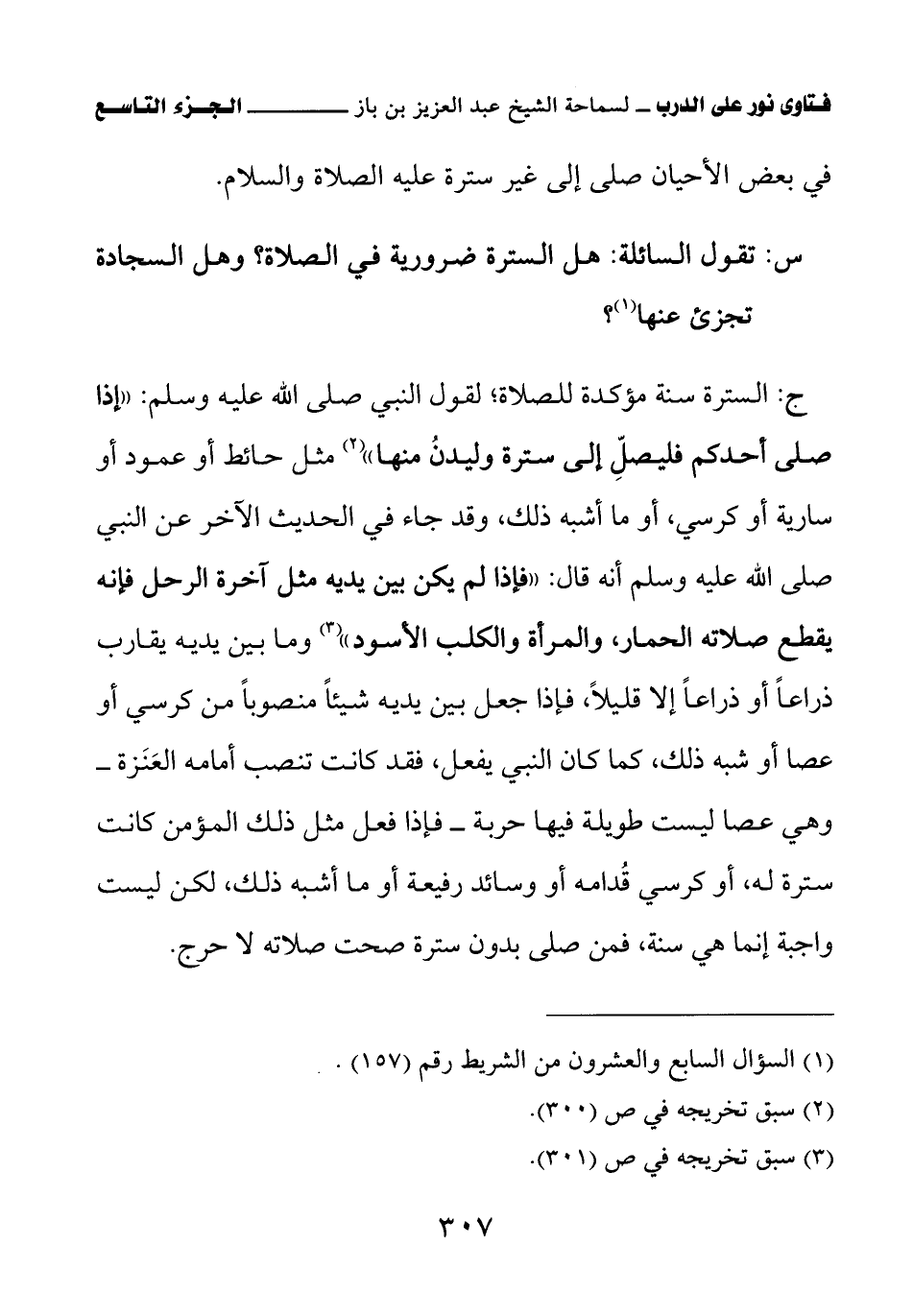 ج: السترة سنة مؤكدة للصلاة؛ لقول النبي صلى الله عليه وسلم: «إذا صلى أحدكم فليصل إلى سترة وليدن منها (¬2)» مثل حائط أو عمود أو سارية أو كرسي، أو ما أشبه ذلك، وقد جاء في الحديث الآخر عن النبي صلى الله عليه وسلم أنه قال: «فإذا لم يكن بين يديه مثل آخرة الرحل فإنه يقطع صلاته الحمار، والمرأة، والكلب الأسود (¬3)» وما بين يديه يقارب ذراعا أو ذراعا إلا قليلا، فإذا جعل بين يديه شيئا منصوبا من كرسي أو عصا أو شبه ذلك، كما كان النبي يفعل، فقد كانت تنصب أمامه العنزة – وهي عصا ليست طويلة فيها حربة – فإذا فعل مثل ذلك المؤمن كانت سترة له، أو كرسي قدامه أو وسائد رفيعة أو ما أشبه ذلك، لكن ليست واجبة إنما هي سنة، فمن صلى بدون سترة صلاته لا حرج.
