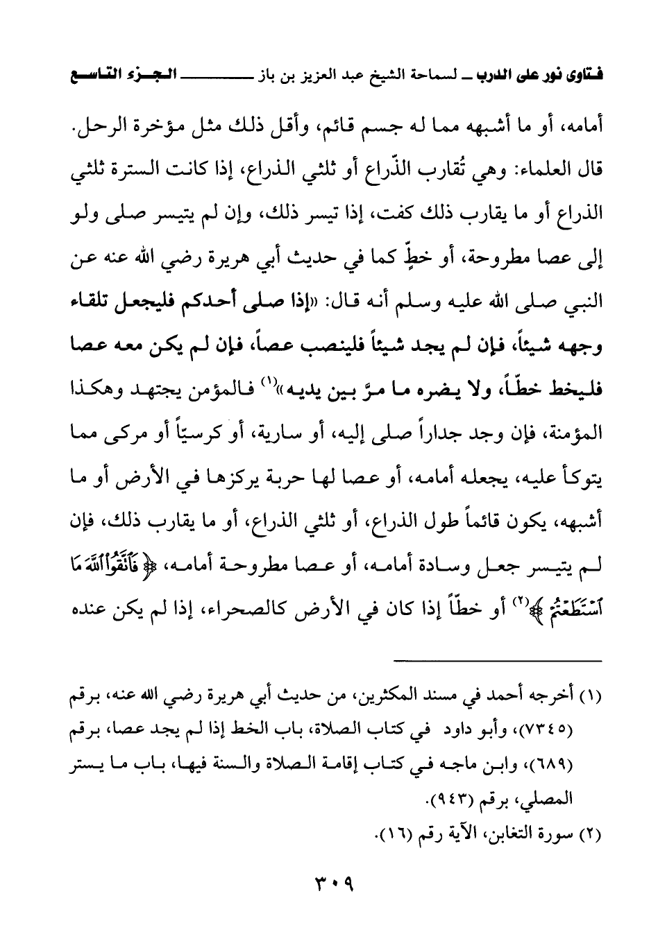 قال العلماء: وهي تقارب الذراع أو ثلثي الذراع، إذا كانت السترة ثلثي الذراع أو ما يقارب ذلك كفت، إذا تيسر ذلك، وإن لم يتيسر صلى ولو إلى عصا مطروحة، أو خط كما في حديث أبي هريرة رضي الله عنه عن النبي صلى الله عليه وسلم أنه قال: «إذا صلى أحدكم فليجعل تلقاء وجهه شيئا، فإن لم يجد شيئا فلينصب عصا، فإن لم يكن معه عصا فليخط خطا، ولا يضره ما مر بين يديه (¬1)» فالمؤمن يجتهد وهكذا المؤمنة، فإن وجد جدارا صلى إليه، أو سارية، أو كرسيا أو مركى مما يتوكأ عليه، يجعله أمامه، أو عصا لها حربة يركزها في الأرض أو ما أشبهه، يكون قائما طول الذراع، أو ثلثي الذراع، أو ما يقارب ذلك، فإن لم يتيسر جعل وسادة أمامه، أو عصا مطروحة أمامه {فَاتَّقُوا اللَّهَ مَا اسْتَطَعْتُمْ} (¬2) أو خطا إذا كان في الأرض كالصحراء، إذا لم يكن عنده