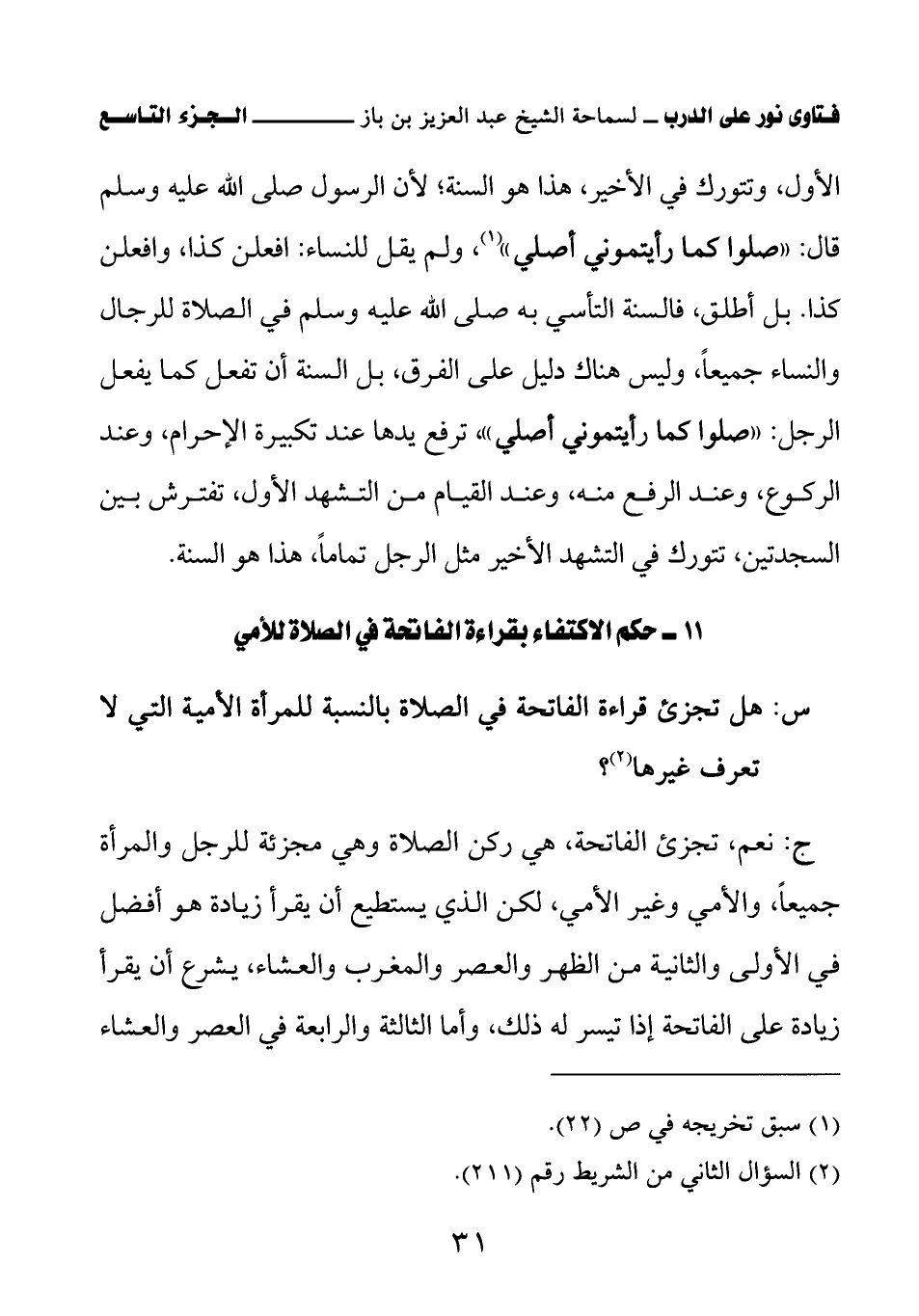 الأول، وتتورك في الأخير، هذا هو السنة؛ لأن الرسول صلى الله عليه وسلم قال: «صلوا كما رأيتموني أصلي (¬1)» ولم يقل للنساء: افعلن كذا، وافعلن كذا. بل أطلق، فالسنة التأسي به صلى الله عليه وسلم في الصلاة للرجال والنساء جميعا، وليس هناك دليل على الفرق، بل السنة أن تفعل كما يفعل الرجل: «صلوا كما رأيتموني أصلي (¬2)»، ترفع يدها عند تكبيرة الإحرام، وعند الركوع، وعند الرفع منه، وعند القيام من التشهد الأول تفترش بين السجدتين، تتورك في التشهد الأخير مثل الرجل تماما، هذا هو السنة.