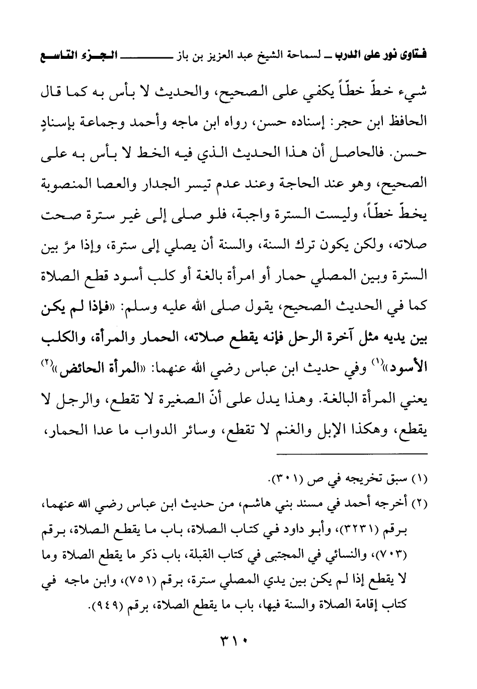 شيء خط خطا يكفي على الصحيح، والحديث لا بأس به كما قال الحافظ ابن حجر: إسناده حسن، رواه ابن ماجه وأحمد وجماعة بإسناد حسن. فالحاصل أن هذا الحديث الذي فيه الخط لا بأس به على الصحيح، وهو عند الحاجة وعند عدم تيسر الجدار والعصا المنصوبة يخط خطا، وليست السترة واجبة، فلو صلى إلى غير سترة صحت صلاته، ولكن يكون ترك السنة، والسنة أن يصلي إلى سترة، وإذا مر بين السترة وبين المصلي حمار أو امرأة بالغة أو كلب أسود قطع الصلاة كما في الحديث الصحيح، يقول صلى الله عليه وسلم: «فإذا لم يكن بين يديه مثل آخرة الرحل فإنه يقطع صلاته، الحمار، والمرأة، والكلب الأسود (¬1)» وفي حديث ابن عباس رضي الله عنهما: «المرأة الحائض (¬2)» يعني المرأة البالغة. وهذا يدل على أن الصغيرة لا تقطع، والرجل لا يقطع، وهكذا الإبل والغنم لا تقطع، وسائر الدواب ما عدا الحمار،