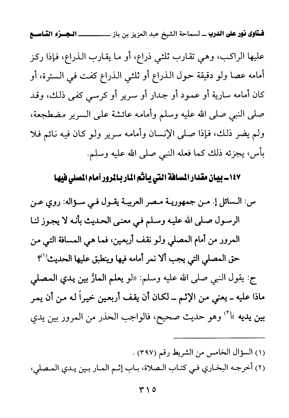ج: يقول النبي صلى الله عليه وسلم: «لو يعلم المار بين يدي المصلي ماذا عليه – يعني من الإثم – لكان أن يقف أربعين خيرا له من أن يمر بين يديه (¬2)» وهو حديث صحيح، فالواجب الحذر من المرور بين يدي