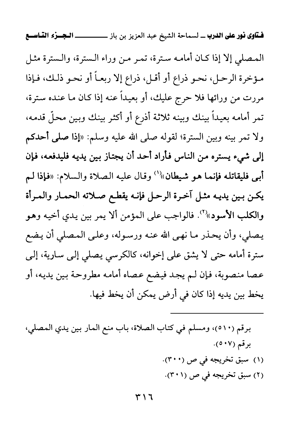 المصلي إلا إذا كان أمامه سترة، تمر من وراء السترة، والسترة مثل مؤخرة الرحل، نحو ذراع أو أقل، ذراع إلا ربعا أو نحو ذلك، فإذا مررت من ورائها فلا حرج عليك، أو بعيدا عنه إذا كان ما عنده سترة، تمر أمامه بعيدا بينك وبينه ثلاثة أذرع أو أكثر بينك وبين محل قدمه، ولا تمر بينه وبين السترة؛ لقوله صلى الله عليه وسلم: «إذا صلى أحدكم إلى شيء يستره من الناس فأراد أحد أن يجتاز بين يده فليدفعه، فإن أبى فليقاتله فإنما هو شيطان (¬1)» وقال عليه الصلاة والسلام: «فإذا لم يكن بين يديه مثل آخرة الرحل فإنه يقطع صلاته الحمار والمرأة والكلب الأسود (¬2)» فالواجب على المؤمن ألا يمر بين يدي أخيه وهو يصلي، وأن يحذر ما نهى الله عنه ورسوله، وعلى المصلي أن يضع سترة أمامه حتى لا يشق على إخوانه، كالكرسي يصلي إلى سارية، إلى عصا منصوبة، فإن لم يجد فيضع عصاه أمامه مطروحة بين يديه، أو يخط بين يديه إذا كان في أرض يمكن أن يخط فيها.