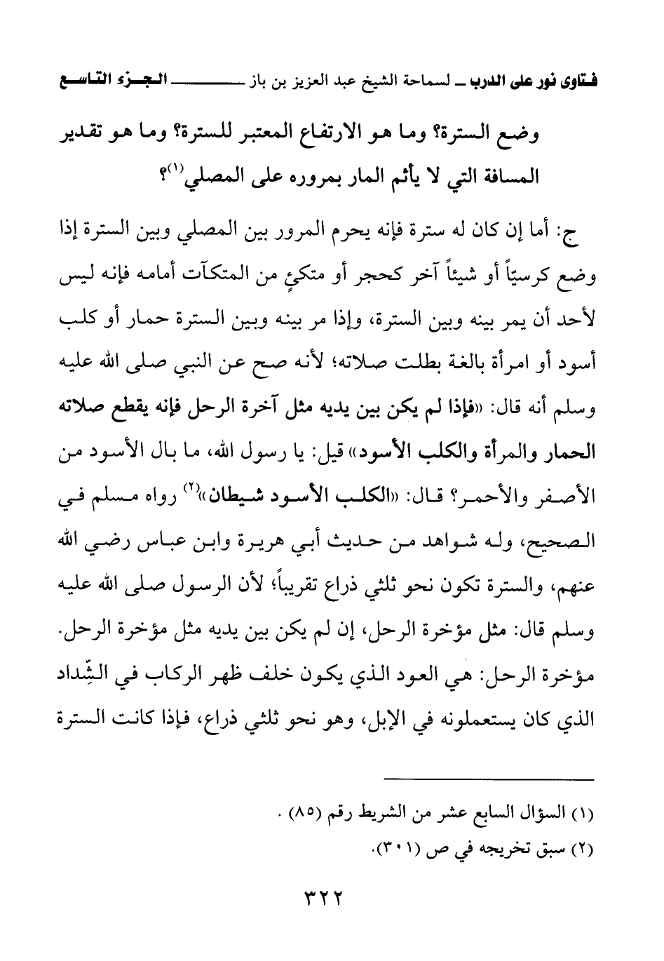 ج: أما إن كان له سترة فإنه يحرم المرور بين المصلي وبين السترة إذا وضع كرسيا أو شيئا آخر كحجر أو متكئ من المتكآت أمامه فإنه ليس لأحد أن يمر بينه وبين السترة، وإذا مر بينه وبين السترة حمار أو كلب أسود أو امرأة بالغة بطلت صلاته؛ لأنه صح عن النبي صلى الله عليه وسلم أنه قال: «فإذا لم يكن بين يديه مثل آخرة الرحل فإنه يقطع صلاته الحمار والمرأة والكلب الأسود قيل: يا رسول الله، ما بال الأسود من الأصفر والأحمر؟ قال: الكلب الأسود شيطان (¬2)» رواه مسلم في الصحيح، وله شواهد من حديث أبي هريرة وابن عباس رضي الله عنهم، والسترة تكون نحو ثلثي ذراع تقريبا؛ لأن الرسول صلى الله عليه وسلم قال: مثل مؤخرة الرحل، إن لم يكن بين يديه مثل مؤخرة الرحل.