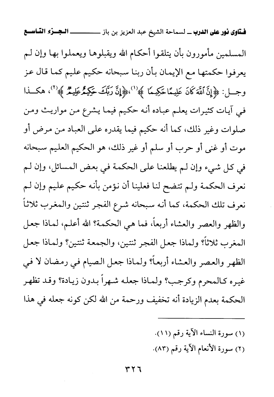 المسلمين مأمورون بأن يتلقوا أحكام الله ويقبلوها ويعملوا بها وإن لم يعرفوا حكمتها مع الإيمان بأن ربنا سبحانه حكيم عليم كما قال عز وجل: {إِنَّ اللَّهَ كَانَ عَلِيمًا حَكِيمًا} (¬1)، {إِنَّ رَبَّكَ حَكِيمٌ عَلِيمٌ} (¬2) هكذا في آيات كثيرات يعلم عباده أنه حكيم فيما يشرع من مواريث ومن صلوات وغير ذلك، كما أنه حكيم فيما يقدره على العباد من مرض أو موت أو غنى أو حرب أو سلم أو غير ذلك، هو الحكيم العليم سبحانه في كل شيء وإن لم يطلعنا على الحكمة في بعض المسائل، وإن لم نعرف الحكمة ولم تتضح لنا فعلينا أن نؤمن بأنه حكيم عليم وإن لم نعرف تلك الحكمة، كما أنه سبحانه شرع الفجر ثنتين، والمغرب ثلاثا، والظهر والعصر والعشاء أربعا، فما هي الحكمة؟ الله أعلم، لماذا جعل المغرب ثلاثا؟ ولماذا جعل الفجر ثنتين، والجمعة ثنتين؟ ولماذا جعل الظهر والعصر والعشاء أربعا؟ ولماذا جعل الصيام في رمضان لا في غيره كالمحرم وكرجب؟ ولماذا جعله شهرا بدون زيادة؟ وقد تظهر الحكمة بعدم الزيادة أنه تخفيف ورحمة من الله لكن كونه جعله في هذا
