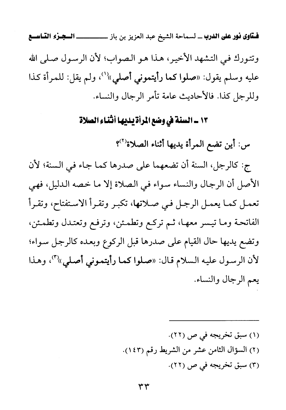 وتتورك في التشهد الأخير، هذا هو الصواب؛ لأن الرسول صلى الله عليه وسلم يقول: «صلوا كما رأيتموني أصلي (¬1)» ولم يقل: للمرأة كذا، وللرجل كذا. فالأحاديث عامة تأمر الرجال والنساء.