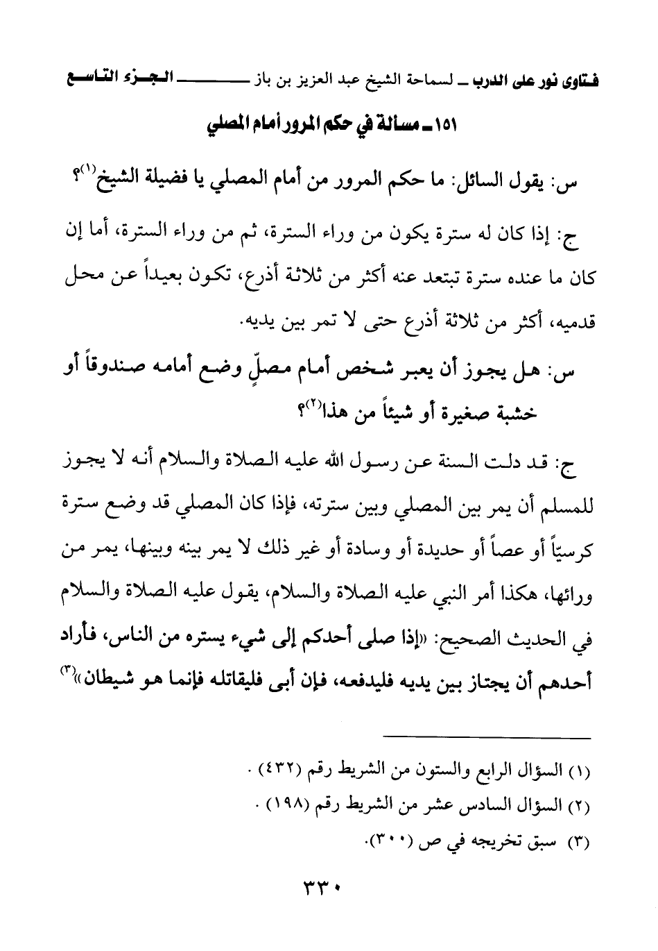 ج: إذا كان له سترة يكون من وراء السترة، ثم من وراء السترة، أما إن كان ما عنده سترة تبتعد عنه أكثر من ثلاثة أذرع، تكون بعيدا عن محل قدميه، أكثر من ثلاثة أذرع حتى لا تمر بين يديه.