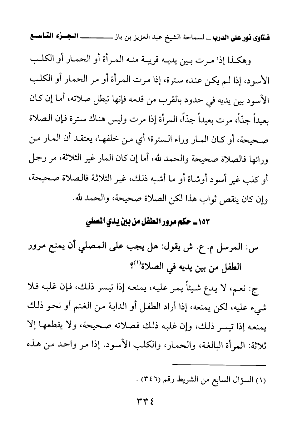 وهكذا إذا مرت بين يديه قريبة منه المرأة أو الحمار أو الكلب الأسود، إذا لم يكن عنده سترة، إذا مرت المرأة أو مر الحمار أو الكلب الأسود بين يديه في حدود بالقرب من قدمه فإنها تبطل صلاته، أما إن كان بعيدا جدا، مرت بعيدا جدا، المرأة إذا مرت وليس هناك سترة فإن الصلاة صحيحة، أو كان المار وراء السترة؛ أي من خلفها، يعتقد أن المار من ورائها فالصلاة صحيحة والحمد لله، أما إن كان المار غير الثلاثة، مر رجل أو كلب غير أسود أو شاة أو ما أشبه ذلك، غير الثلاثة فالصلاة صحيحة، وإن كان ينقص ثواب هذا لكن الصلاة صحيحة، والحمد لله.