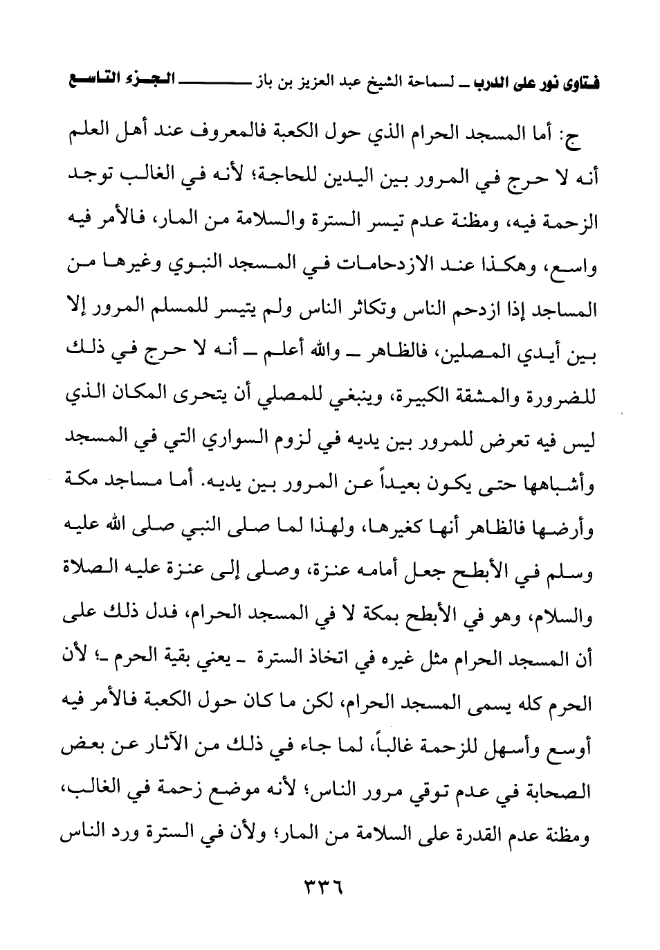 ج: أما المسجد الحرام الذي حول الكعبة فالمعروف عند أهل العلم أنه لا حرج في المرور بين اليدين للحاجة؛ لأنه في الغالب توجد الزحمة فيه، ومظنة عدم تيسر السترة والسلامة من المار، فالأمر فيه واسع، وهكذا عند الازدحامات في المسجد النبوي وغيرها من المساجد إذا ازدحم الناس وتكاثر الناس ولم يتيسر للمسلم المرور إلا بين أيدي المصلين، فالظاهر – والله أعلم – أنه لا حرج في ذلك للضرورة والمشقة الكبيرة، وينبغي للمصلي أن يتحرى المكان الذي ليس فيه تعرض للمرور بين يديه في لزوم السواري التي في المسجد وأشباهها حتى يكون بعيدا عن المرور بين يديه. أما مساجد مكة وأرضها فالظاهر أنها كغيرها، ولهذا لما صلى النبي صلى الله عليه وسلم في الأبطح جعل أمامه عنزة، وصلى إلى عنزة عليه الصلاة والسلام، وهو في الأبطح بمكة لا في المسجد الحرام، فدل ذلك على أن المسجد الحرام مثل غيره في اتخاذ السترة – يعني بقية الحرم – لأن الحرم كله يسمى المسجد الحرام، لكن ما كان حول الكعبة فالأمر فيه أوسع وأسهل للزحمة غالبا، لما جاء في ذلك من الآثار عن بعض الصحابة في عدم توقي مرور الناس؛ لأنه موضع زحمة في الغالب، ومظنة عدم القدرة على السلامة من المار؛ ولأن في السترة ورد الناس