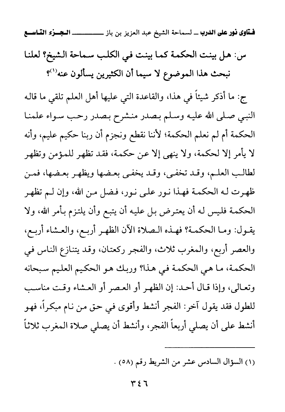 ج: ما أذكر شيئا في هذا، والقاعدة التي عليها أهل العلم تلقي ما قاله النبي صلى الله عليه وسلم بصدر منشرح بصدر رحب سواء علمنا الحكمة أم لم نعلم الحكمة؛ لأننا نقطع ونجزم أن ربنا حكيم عليم، وأنه لا يأمر إلا لحكمة، ولا ينهى إلا عن حكمة، فقد تظهر للمؤمن وتظهر لطالب العلم، وقد تخفى، وقد يخفى بعضها ويظهر بعضها، فمن ظهرت له الحكمة فهذا نور على نور، فضل من الله، وإن لم تظهر الحكمة فليس له أن يعترض بل عليه أن يتبع وأن يلتزم بأمر الله، ولا يقول: وما الحكمة؟ فهذه الصلاة الآن الظهر أربع، والعشاء أربع، والعصر أربع، والمغرب ثلاث، والفجر ركعتان، وقد يتنازع الناس في الحكمة، ما هي الحكمة في هذا؟ وربك هو الحكيم العليم سبحانه وتعالى، وإذا قال أحد: إن الظهر أو العصر أو العشاء وقت مناسب للطول فقد يقول آخر: الفجر أنشط وأقوى في حق من نام مبكرا، فهو أنشط على أن يصلي أربعا الفجر، وأنشط أن يصلي صلاة المغرب ثلاثا