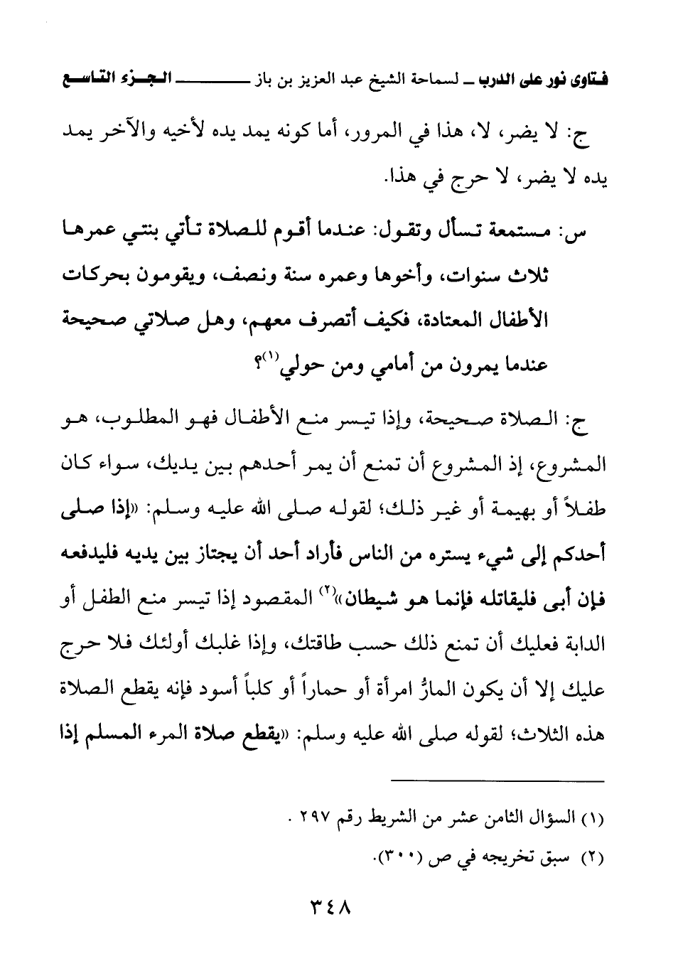 ج: الصلاة صحيحة، وإذا تيسر منع الأطفال فهو المطلوب، هو المشروع، إذا المشروع أن تمنع أن يمر أحدهم بين يديك، سواء كان طفلا أو بهيمة أو غير ذلك؛ لقوله صلى الله عليه وسلم: «إذا صلى أحدكم إلى شيء يستره من الناس فأراد أحد أن يجتاز بين يديه فليدفعه فإن أبى فليقاتله فإنما هو شيطان (¬2)» المقصود إذا تيسر منع الطفل أو الدابة فعليك أن تمنع ذلك حسب طاقتك، وإذا غلبك أولئك فلا حرج عليك إلا أن يكون المار امرأة أو حمارا أو كلبا أسود فإنه يقطع الصلاة هذه الثلاث؛ لقوله صلى الله عليه وسلم: «يقطع صلاة المرء المسلم إذا