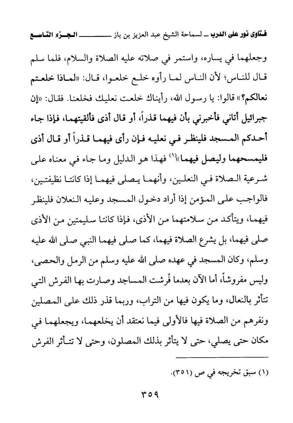 وجعلهما في يساره، واستمر في صلاته عليه الصلاة والسلام، فلما سلم قال للناس؛ لأن الناس لما رأوه خلع خلعوا، قال: (لماذا خلعتم نعالكم؟) قالوا: يا رسول الله، رأيناك خلعت نعليك فخلعنا. فقال: «إن جبرائيل أتاني أخبرني بأن فيهما قذرا، أو قال أذى فألقيتهما، فإذا جاء أحدكم المسجد فلينظر في نعليه فإن رأى فيهما قذرا أو قال أذى فليمسحهما وليصل فيهما (¬1)» فهذا هو الدليل وما جاء في معناه على شرعية الصلاة في النعلين، وأنهما يصلى فيهما إذا كانتا نظيفتين، فالواجب على المؤمن إذا أراد دخول المسجد وعليه النعلان فلينظر فيهما، ويتأكد من سلامتهما من الأذى، فإذا كانتا سليمتين من الأذى صلى فيهما، بل يشرع الصلاة فيهما كما صلى فيهما النبي صلى الله عليه وسلم، وكان المسجد في عهده صلى الله عليه وسلم من الرمل والحصى، وليس مفروشا، أما الآن بعدما فرشت المساجد وصارت بها الفرش التي تتأثر بالنعال، وما يكون فيها من التراب، وربما قذر ذلك على المصلين ونفرهم من الصلاة فيها فالأولى فيما نعتقد أن يخلعهما، ويجعلهما في مكان حتى يصلي، حتى لا يتأثر بذلك المصلون، وحتى لا تتأثر الفرش