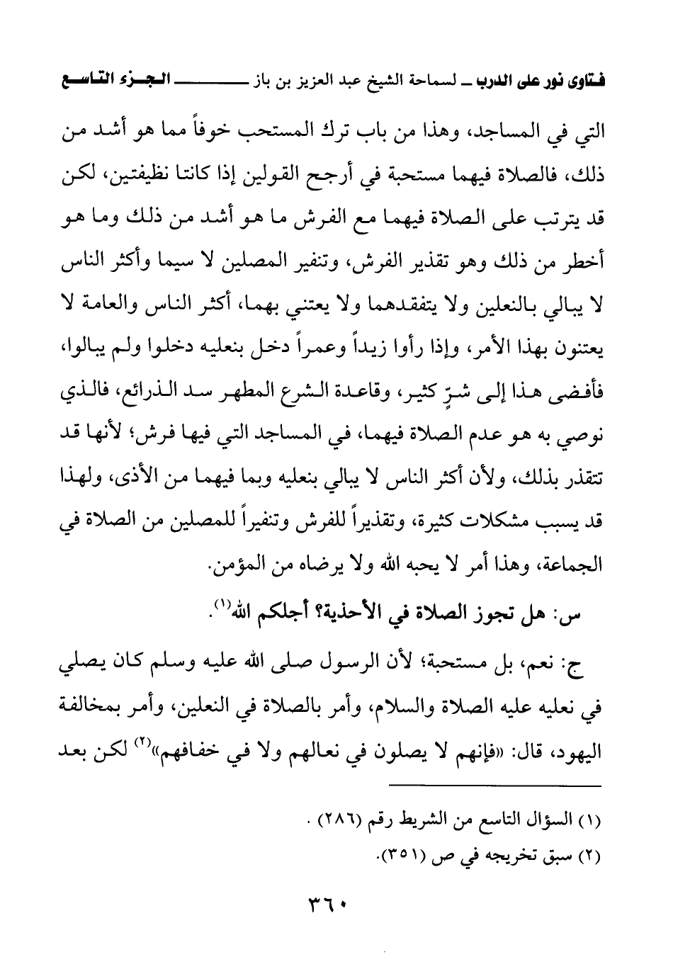 ج: نعم، بل مستحبة؛ لأن الرسول صلى الله عليه وسلم كان يصلي في نعليه عليه الصلاة والسلام، وأمر بالصلاة في النعلين، وأمر بمخالفة اليهود، قال: «فإنهم لا يصلون في نعالهم ولا في خفافهم (¬2)» لكن بعد