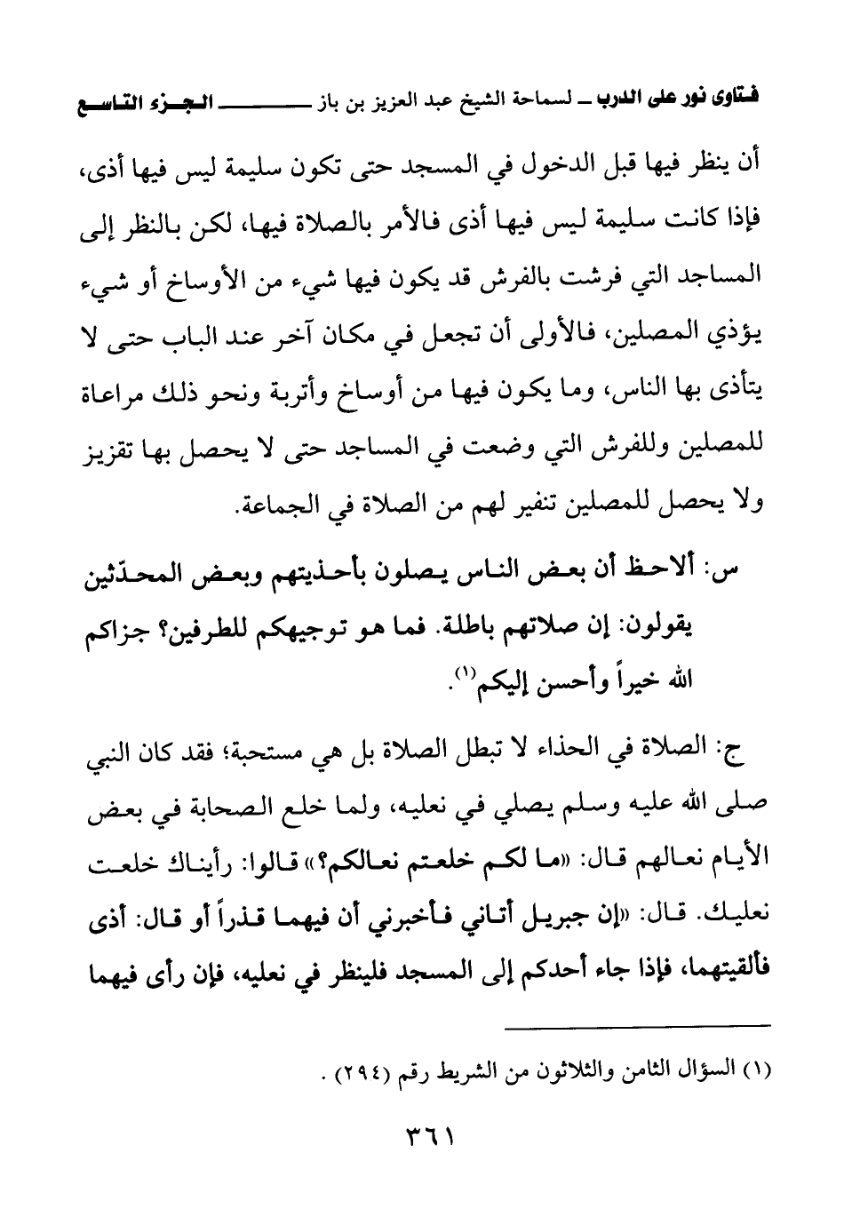 س: ألاحظ أن بعض الناس يصلون بأحذيتهم وبعض المحدثين يقولون: إن صلاتهم باطلة. فما هو توجيهكم للطرفين؟ جزاكم الله خيرا وأحسن إليكم. (¬1)