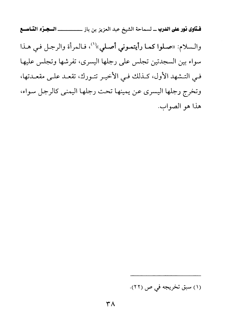 والسلام: «صلوا كما رأيتموني أصلي (¬1)» فالمرأة والرجل في هذا سواء، بين السجدتين تجلس على رجلها اليسرى، تفرشها وتجلس عليها في التشهد الأول، كذلك في الأخير تتورك، تقعد على مقعدتها، وتخرج رجلها اليسرى عن يمينها تحت رجلها اليمنى كالرجل سواء، هذا هو الصواب.