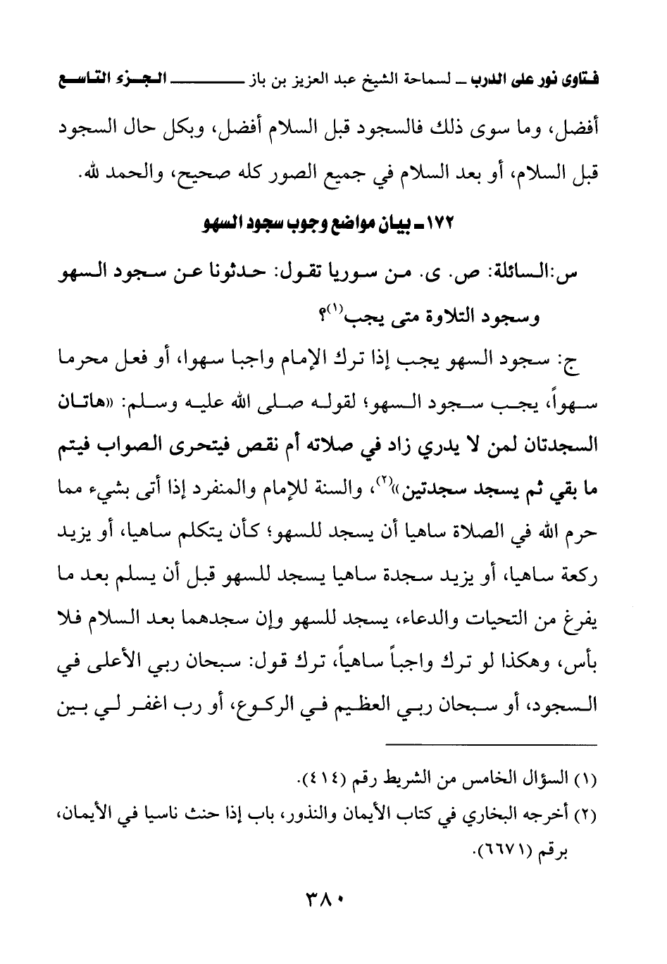 ج: سجود السهو يجب إذا ترك الإمام واجبا سهوا، أو فعل محرما سهوا، يجب سجود السهو؛ لقوله صلى الله عليه وسلم: «هاتان السجدتان لمن لا يدري زاد في صلاته أو نقص فيتحرى الصواب فيتم ما بقي ثم يسجد سجدتين (¬2)» والسنة للإمام والمنفرد إذا أتى بشيء مما حرم الله في الصلاة ساهيا أن يسجد للسهو؛ كأن يتكلم ساهيا، أو يزيد ركعة ساهيا، أو يزيد سجدة ساهيا يسجد للسهو قبل أن يسلم بعدما يفرغ من التحيات والدعاء، يسجد للسهو. وإن سجدهما بعد السلام فلا بأس، وهكذا لو ترك واجبا ساهيا، ترك قول: سبحان ربي الأعلى في السجود، أو سبحان ربي العظيم في الركوع، أو رب اغفر لي بين