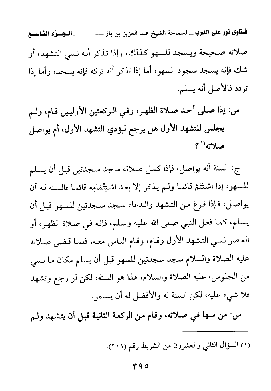 س: من سها في صلاته، وقام من الركعة الثانية قبل أن يتشهد ولم