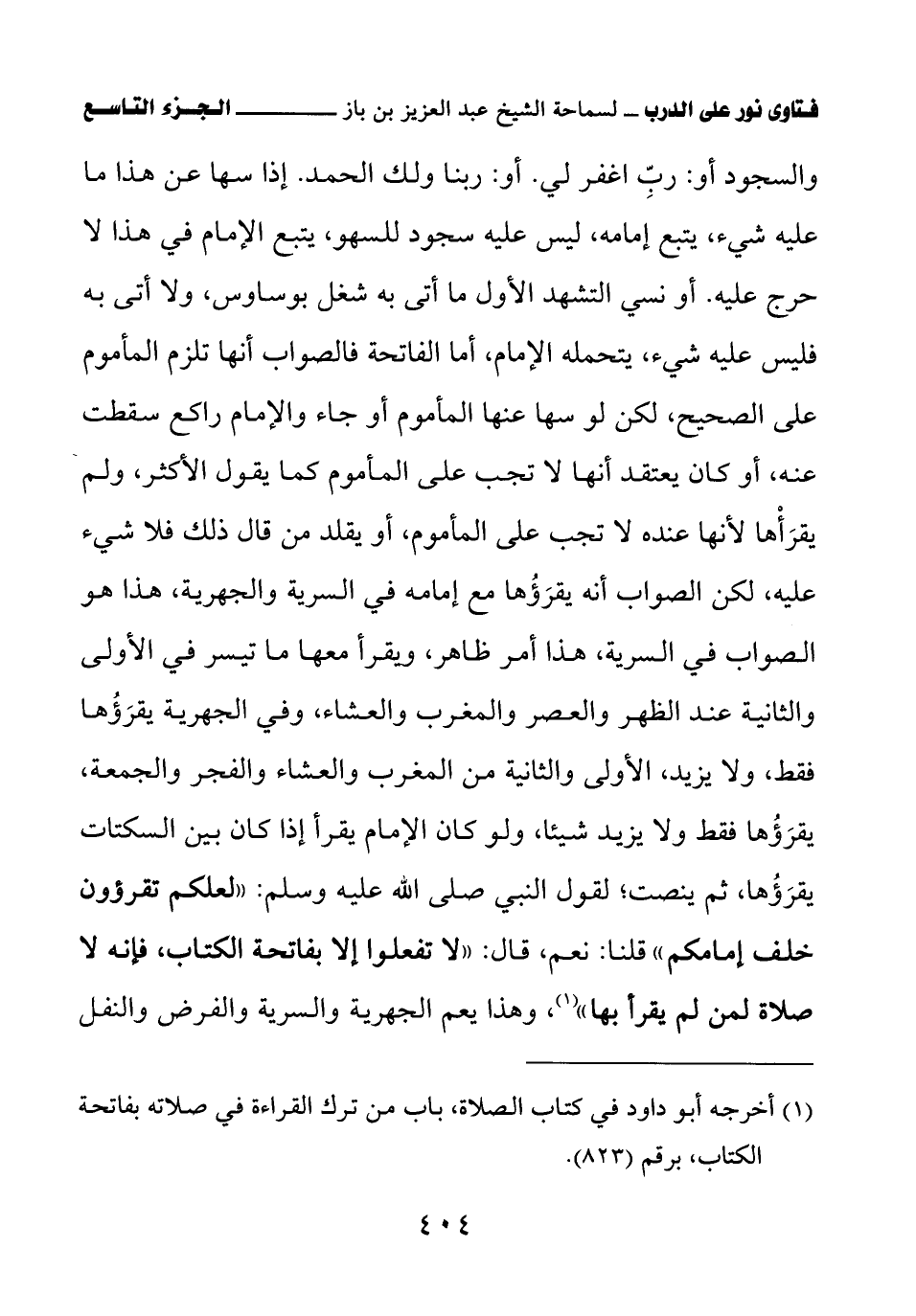والسجود، أو: رب اغفر لي، أو: ربنا ولك الحمد. إذا سها عن هذا ما عليه شيء، يتبع إمامه، ليس عليه سجود للسهو، يتبع الإمام في هذا لا حرج عليه. أو نسي التشهد الأول ما أتى به، شغل بوساوس ولا أتى به فليس عليه شيء، يتحمله الإمام، أما الفاتحة فالصواب أنها تلزم المأموم على الصحيح، لكن لو سها عنها المأموم أو جاء والإمام راكع سقطت عنه، أو كان يعتقد أنها لا تجب على المأموم كما يقول الأكثر، ولم يقرأها لأنها عنده لا تجب على المأموم، أو يقلد من قال ذلك فلا شيء عليه، لكن الصواب أنه يقرؤها مع إمامه في السرية والجهرية، هذا هو الصواب في السرية، هذا أمر ظاهر، ويقرأ معها ما تيسر في الأولى والثانية عند الظهر والعصر والمغرب والعشاء، وفي الجهرية يقرؤها فقط ولا يزيد، الأولى والثانية من المغرب والعشاء والفجر والجمعة، يقرؤها فقط ولا يزيد شيئا، ولو كان الإمام يقرأ إذا كان بين السكتات يقرؤها ثم ينصت؛ لقول النبي صلى الله عليه وسلم: «لعلكم تقرؤون خلف إمامكم! قلنا: نعم. قال: لا تفعلوا إلا بفاتحة الكتاب، فإنه لا صلاة لمن لم يقرأ بها (¬1)» وهذا يعم الجهرية والسرية والفرض والنفل