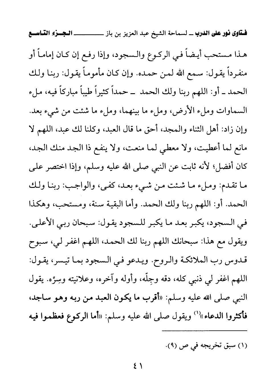 هذا مستحب أيضا في الركوع والسجود، وإذا رفع إن كان إماما أو منفردا يقول: سمع الله لمن حمده. وإن كان مأموما يقول: ربنا ولك الحمد – أو اللهم ربنا ولك الحمد - حمدا كثيرا طيبا مباركا فيه، ملء السماوات وملء الأرض وملء ما بينهما، وملء ما شئت من شيء بعد. وإن زاد: أهل الثناء والمجد، أحق ما قال العبد، وكلنا لك عبد، اللهم لا مانع لما أعطيت، ولا معطي لما منعت، ولا ينفع ذا الجد منك الجد، كان أفضل؛ لأنه ثابت عن النبي صلى الله عليه وسلم، وإذا اختصر على ما تقدم: وملء ما شئت من شيء بعد، كفى، والواجب: ربنا ولك الحمد. أو: اللهم ربنا ولك الحمد. وأما بقية سنة، ومستحب وهكذا في السجود، يكبر بعدما يكبر للسجود يقول: سبحان ربي الأعلى. ويقول مع هذا: سبحانك اللهم ربنا لك الحمد، اللهم اغفر لي، سبوح قدوس رب الملائكة والروح. ويدعو في السجود بما تيسر، يقول: اللهم اغفر لي ذنبي كله، دقه وجله، وأوله وآخره، وعلانيته وسره. يقول النبي صلى الله عليه وسلم: «أقرب ما يكون العبد من ربه وهو ساجد، فأكثروا الدعاء (¬1)» ويقول صلى الله عليه وسلم: «أما الركوع فعظموا فيه