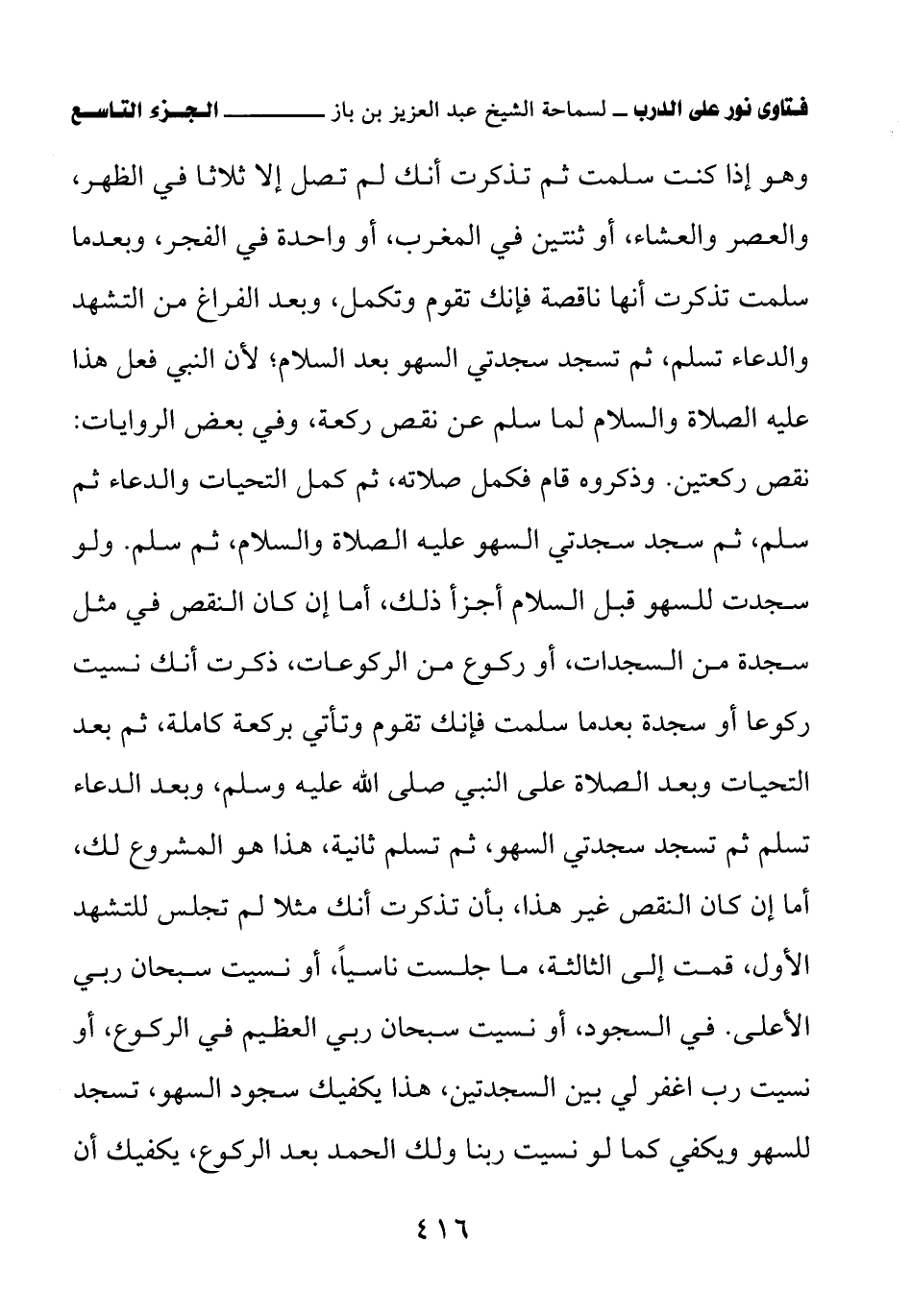 وهو إذا كنت سلمت ثم تذكرت أنك لم تصل إلا ثلاثا في الظهر والعصر والعشاء، أو ثنتين في المغرب، أو واحدة في الفجر، وبعدما سلمت تذكرت أنها ناقصة فإنك تقوم وتكمل، وبعد الفراغ من التشهد والدعاء تسلم ثم تسجد سجدتي السهو بعد السلام؛ لأن النبي فعل هذا - عليه الصلاة والسلام - لما سلم عن نقص ركعة، وفي بعض الروايات نقص ركعتين، وذكروه قام فكمل صلاته، ثم كمل التحيات والدعاء ثم سلم، ثم سجد سجدتي السهو - عليه الصلاة والسلام - ثم سلم. ولو سجدت للسهو قبل السلام أجزأ ذلك، أما إن كان النقص في مثل سجدة من السجدات أو ركوع من الركوعات، ذكرت أنك نسيت ركوعا أو سجدة بعدما سلمت فإنك تقوم وتأتي بركعة كاملة، ثم بعد التحيات وبعد الصلاة على النبي - صلى الله عليه وسلم - وبعد الدعاء تسلم ثم تسجد سجدتي السهو ثم تسلم ثانية، هذا هو المشروع لك، أما إن كان النقص غير هذا بأن تذكرت أنك مثلا لم تجلس للتشهد الأول، قمت إلى الثالثة ما جلست ناسيا، أو نسيت سبحان ربي الأعلى في السجود، أو نسيت سبحان ربي العظيم في الركوع، أو نسيت رب اغفر لي بين السجدتين، هذا يكفيك سجود السهو، تسجد للسهو ويكفي كما لو نسيت ربنا ولك الحمد بعد الركوع، يكفيك أن