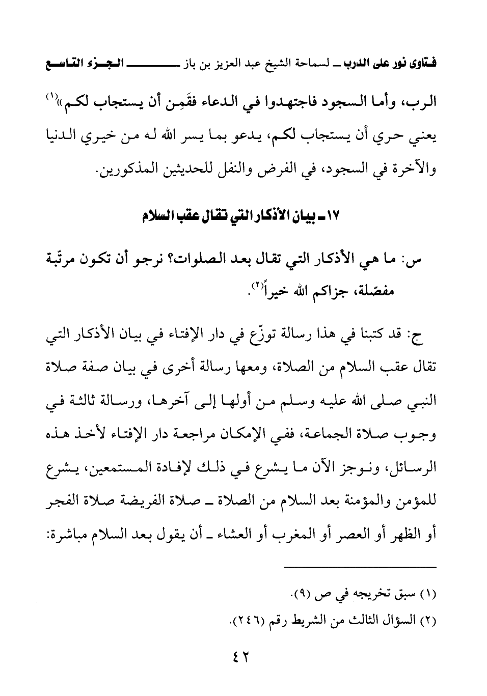 ج: قد كتبنا في هذا رسالة توزع في دار الإفتاء في بيان الأذكار التي تقال عقب السلام من الصلاة، ومعها رسالة أخرى في بيان صفة صلاة النبي صلى الله عليه وسلم من أولها إلى آخرها، ورسالة ثالثة في وجوب صلاة الجماعة، ففي الإمكان مراجعة دار الإفتاء لأخذ هذه الرسائل، ونوجز الآن ما يشرع في ذلك لإفادة المستمعين، يشرع للمؤمن والمؤمنة بعد السلام من الصلاة – صلاة الفريضة صلاة الفجر أو الظهر أو العصر أو المغرب أو العشاء – أن يقول بعد السلام مباشرة: