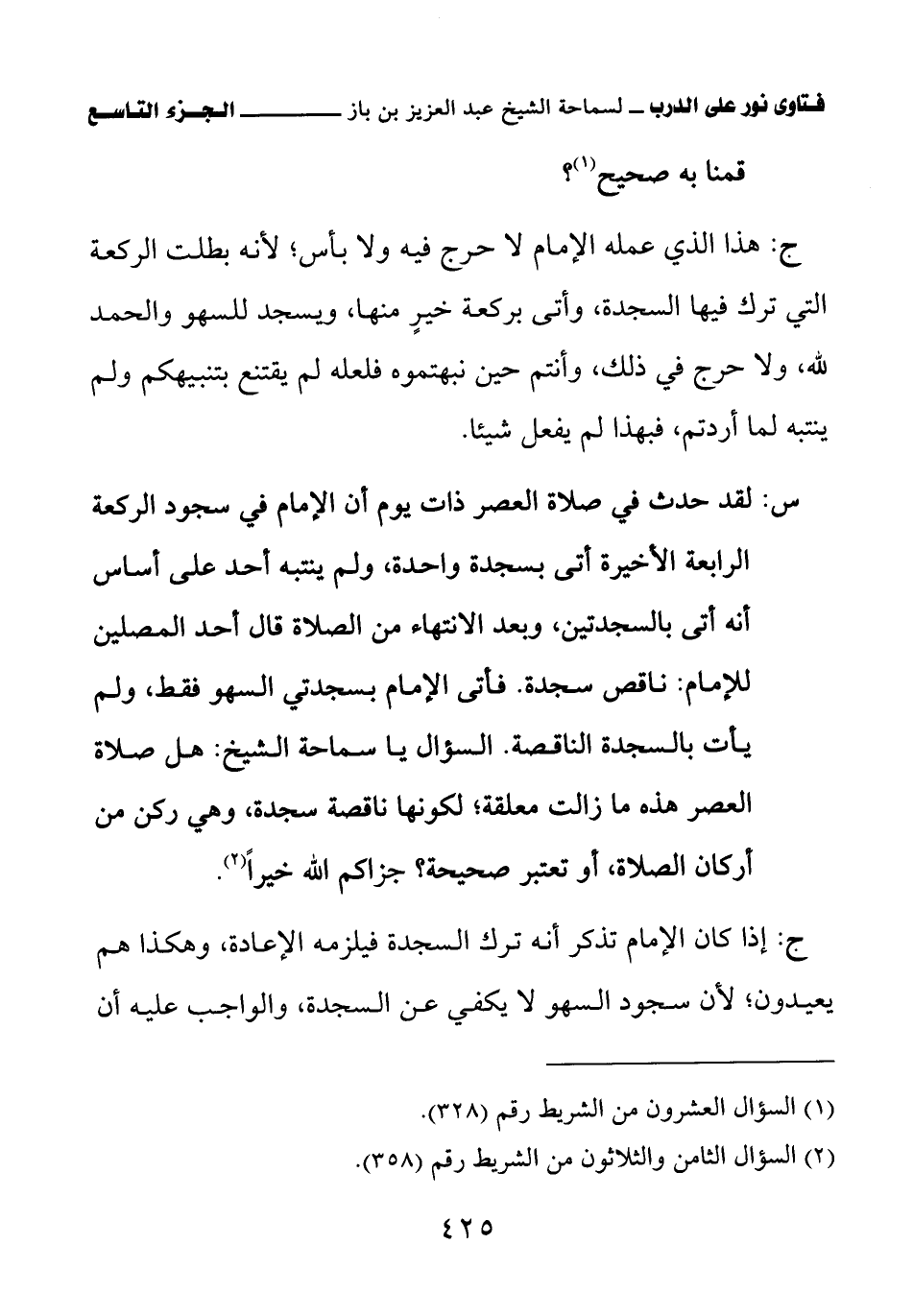 س: لقد حدث في صلاة العصر ذات يوم أن الإمام في سجود الركعة الرابعة الأخيرة أتى بسجدة واحدة ولم ينتبه أحد على أساس أنه أتى بالسجدتين، وبعد الانتهاء من الصلاة قال أحد المصلين للإمام: ناقص سجدة، فأتى الإمام بسجدتي السهو فقط ولم يأت بالسجدة الناقصة. السؤال يا سماحة الشيخ: هل صلاة العصر هذه ما زالت معلقة لكونها ناقصة سجدة وهي ركن من أركان الصلاة؟ أو تعتبر صحيحة؟ جزاكم الله خيرا (¬2)