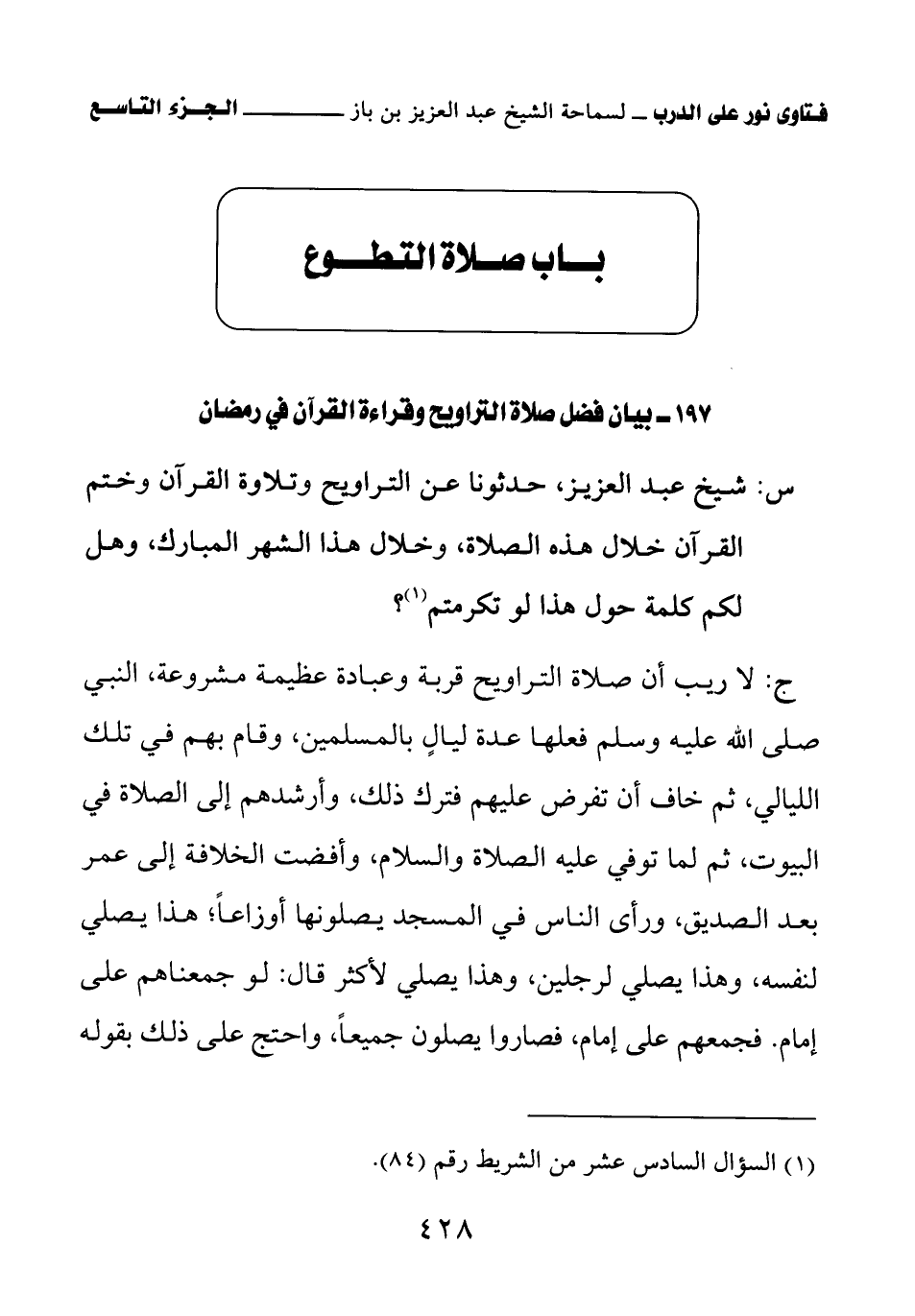 س: شيخ عبد العزيز، حدثونا عن التراويح وتلاوة القرآن وختم القرآن خلال هذه الصلاة وخلال هذا الشهر المبارك، وهل لكم كلمة حول هذا لو تكرمتم (¬1)؟