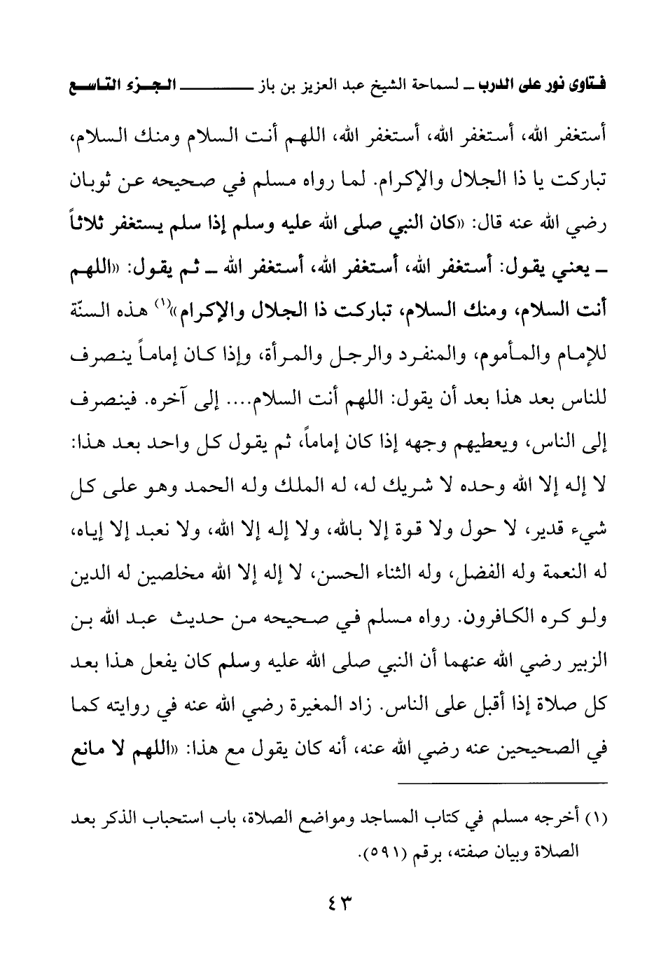 أستغفر الله، أستغفر الله، أستغفر الله، اللهم أنت السلام ومنك السلام، تباركت يا ذا الجلال والإكرام؛ لما رواه مسلم في صحيحه عن ثوبان رضي الله عنه قال: «كان النبي صلى الله عليه وسلم إذا سلم يستغفر ثلاثا – يعني يقول: أستغفر الله، أستغفر الله، أستغفر الله – ثم يقول: (اللهم أنت السلام، ومنك السلام، تباركت ذا الجلال والإكرام (¬1)» هذه السنة للإمام والمأموم، والمنفرد والرجل والمرأة، وإذا كان إماما ينصرف للناس بعد هذا بعد أن يقول: اللهم أنت السلام ........ إلى آخره. فينصرف إلى الناس، ويعطيهم وجهه إذا كان إماما، ثم يقول كل واحد بعد هذا: لا إله إلا الله وحده لا شريك له، له الملك وله الحمد وهو على كل شيء قدير، لا حول ولا قوة إلا بالله، ولا إله إلا الله، ولا نعبد إلا إياه، له النعمة وله الفضل، وله الثناء الحسن، لا إله إلا الله مخلصين له الدين ولو كره الكافرون. رواه مسلم في صحيحه من حديث عبد الله بن الزبير رضي الله عنهما أن النبي صلى الله عليه وسلم كان يفعل هذا بعد كل صلاة إذا أقبل على الناس. زاد المغيرة رضي الله عنه في روايته كما في الصحيحين عنه رضي الله عنه، أنه يقول مع هذا: «اللهم لا مانع