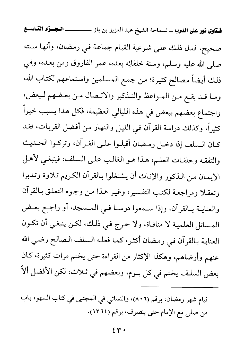 صحيح، فدل ذلك على شرعية القيام جماعة في رمضان وأنها سنته - صلى الله عليه وسلم - وسنة خلفائه بعده، عمر الفاروق ومن بعده، وفي ذلك أيضا مصالح كثيرة؛ من جمع المسلمين واستماعهم لكتاب الله، وما قد يقع من المواعظ والتذكير والاتصال من بعضهم لبعض، واجتماع بعضهم ببعض في هذه الليالي العظيمة، فكل هذا يسبب خيرا كثيرا، وكذلك دراسة القرآن في الليل والنهار من أفضل القربات، فقد كان السلف إذا دخل رمضان أقبلوا على القرآن وتركوا الحديث والتفقه وحلقات العلم، هذا هو الغالب على السلف، فينبغي لأهل الإيمان من الذكور والإناث أن يشتغلوا بالقرآن الكريم تلاوة وتدبرا وتعقلا ومراجعة لكتب التفسير وغير هذا من وجوه التعلق بالقرآن والعناية بالقرآن، وإذا سمعوا درسا في المسجد أو راجع بعض المسائل العلمية لا منافاة ولا حرج في ذلك، لكن ينبغي أن تكون العناية بالقرآن في رمضان أكثر كما فعله السلف الصالح رضي الله عنهم وأرضاهم، وهكذا الإكثار من القراءة حتى يختم مرات كثيرة، كان بعض السلف يختم في كل يوم، وبعضهم في ثلاث، لكن الأفضل ألا