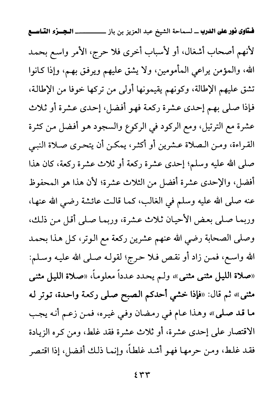 لأنهم أصحاب أشغال، أو لأسباب أخرى فلا حرج، الأمر واسع بحمد الله، والمؤمن يراعي المأمومين ولا يشق عليهم ويرفق بهم، وإذا كانوا تشق عليهم الإطالة وكونهم يقيمونها أولى من تركها خوفا من الإطالة، فإذا صلى بهم إحدى عشرة ركعة فهو أفضل، إحدى عشرة أو ثلاث عشرة مع الترتيل ومع الركود في الركوع والسجود هو أفضل من كثرة القراءة ومن الصلاة عشرين أو أكثر، يمكن أن يتحرى صلاة النبي - صلى الله عليه وسلم - إحدى عشرة ركعة أو ثلاث عشرة ركعة، كان هذا أفضل، والإحدى عشرة أفضل من الثلاث عشرة؛ لأن هذا هو المحفوظ عنه - صلى الله عليه وسلم - في الغالب كما قالت عائشة رضي الله عنها، وربما صلى بعض الأحيان ثلاث عشرة، وربما صلى أقل من ذلك، وصلى الصحابة رضي الله عنهم عشرين ركعة من الوتر، كل هذا بحمد الله واسع، فمن زاد أو نقص فلا حرج؛ لقوله صلى الله عليه وسلم: «صلاة الليل مثنى مثنى (¬1)»، ولم يحدد عددا معلوما، «صلاة الليل مثنى مثنى (¬2)»، ثم قال: «فإذا خشي أحدكم الصبح صلى ركعة واحدة توتر له ما قد صلى (¬3)»، وهذا عام في رمضان وفي غيره، فمن زعم أنه يجب الاقتصار على إحدى عشرة أو ثلاث عشرة فقد غلط، ومن كره الزيادة فقد غلط، ومن حرمها فهو أشد غلطا، وإنما ذلك أفضل، إذا اقتصر