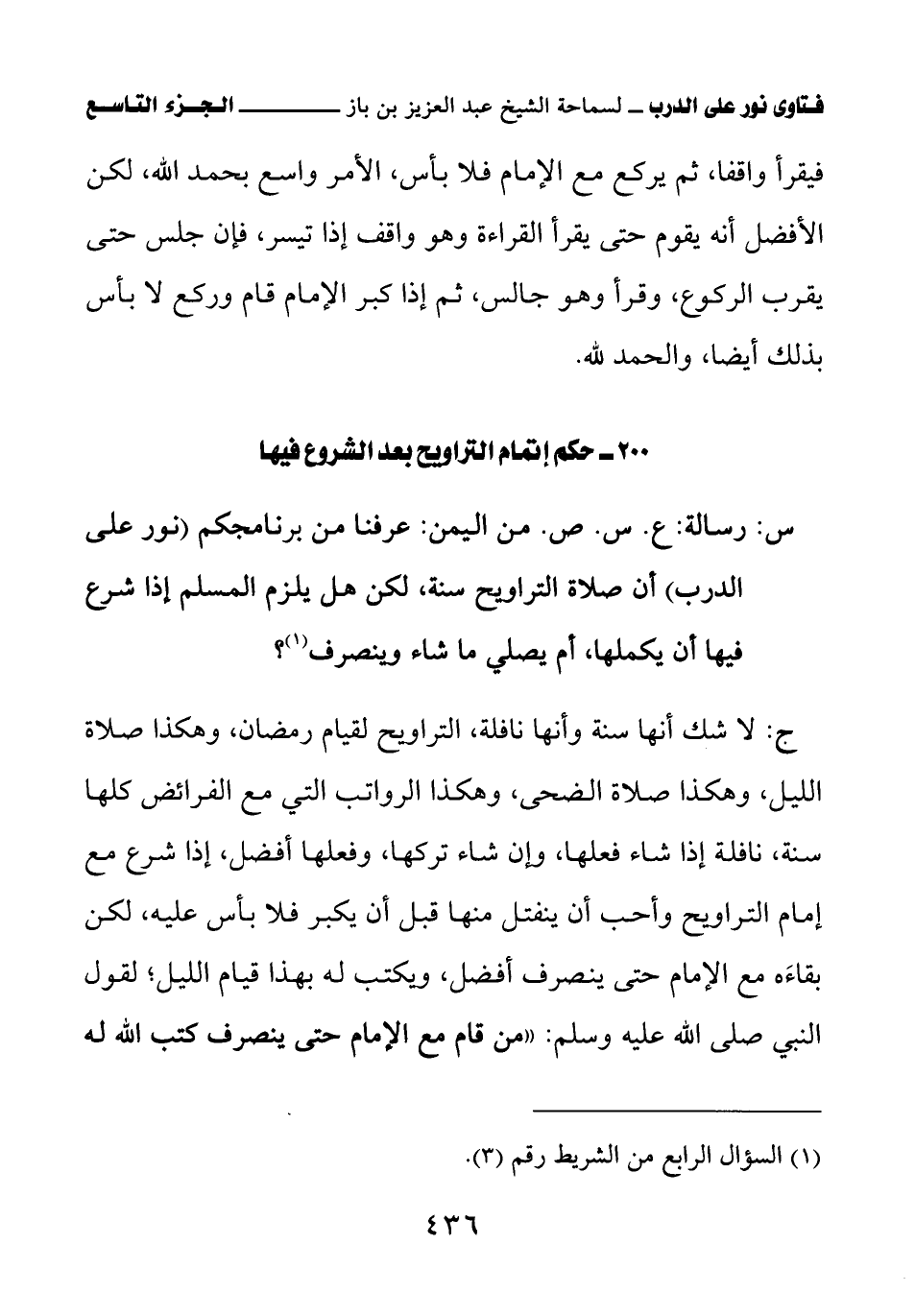 س: رسالة ع. س. ص من اليمن: عرفنا من برنامجكم (نور على الدرب) أن صلاة التراويح سنة، لكن هل يلزم المسلم إذا شرع فيها أن يكملها، أم يصلي ما شاء وينصرف (¬1)؟