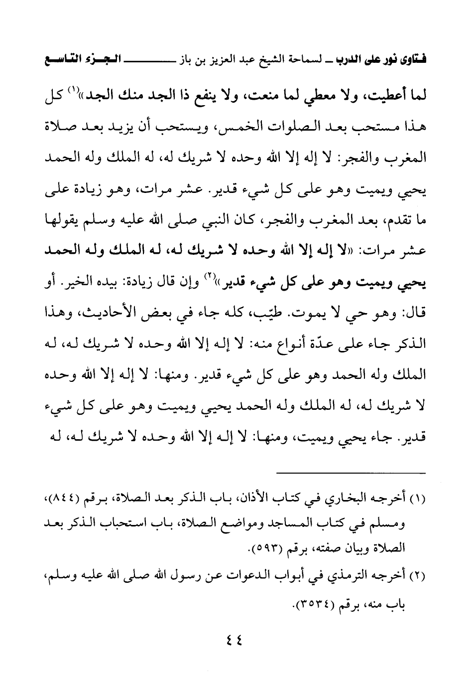 لما أعطيت، ولا معطي لما منعت، ولا ينفع ذا الجد منك الجد (¬1)» كل هذا مستحب بعد الصلوات الخمس، ويستحب أن يزيد بعد صلاة المغرب والفجر: لا إله إلا الله وحده لا شريك له، له الملك وله الحمد يحيي ويميت وهو على كل شيء قدير. عشر مرات، وهو زيادة على ما تقدم، بعد المغرب والفجر، كان النبي صلى الله عليه وسلم يقولها عشر مرات: «لا إله إلا الله وحده لا شريك له، له الملك وله الحمد يحيي ويميت وهو على كل شيء قدير (¬2)» وإن قال زيادة: بيده الخير. أو قال: وهو حي لا يموت. طيب، كله جاء في بعض الأحاديث، وهذا الذكر جاء على عدة أنواع منه: لا إله إلا الله وحده لا شريك له، له الملك وله الحمد وهو على كل شيء قدير. ومنها: لا إله إلا الله وحده لا شريك له، له الملك وله الحمد يحيي ويميت وهو على كل شيء قدير. جاء يحيي ويميت، ومنها: لا إله إلا الله وحده لا شريك له، له