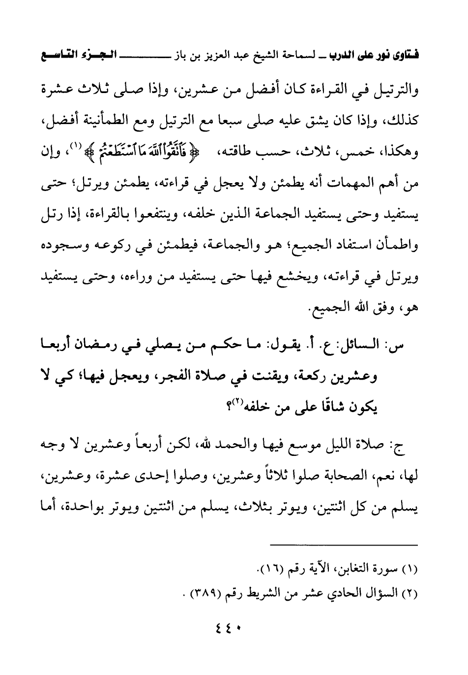 والترتيل في القراءة كان أفضل من عشرين، وإذا صلى ثلاث عشرة كذلك، وإذا كان يشق عليه صلى سبعا مع الترتيل ومع الطمأنينة أفضل، وهكذا خمس - ثلاث، حسب طاقته؛ {فَاتَّقُوا اللَّهَ مَا اسْتَطَعْتُمْ} (¬1)، وإن من أهم المهمات أنه يطمئن ولا يعجل في قراءته، يطمئن ويرتل حتى يستفيد وحتى يستفيد الجماعة الذين خلفه وينتفعوا بالقراءة، إذا رتل واطمأن استفاد الجميع؛ هو والجماعة، فيطمئن في ركوعه وسجوده ويرتل في قراءته ويخشع فيها حتى يستفيد من وراءه وحتى يستفيد هو، وفق الله الجميع.