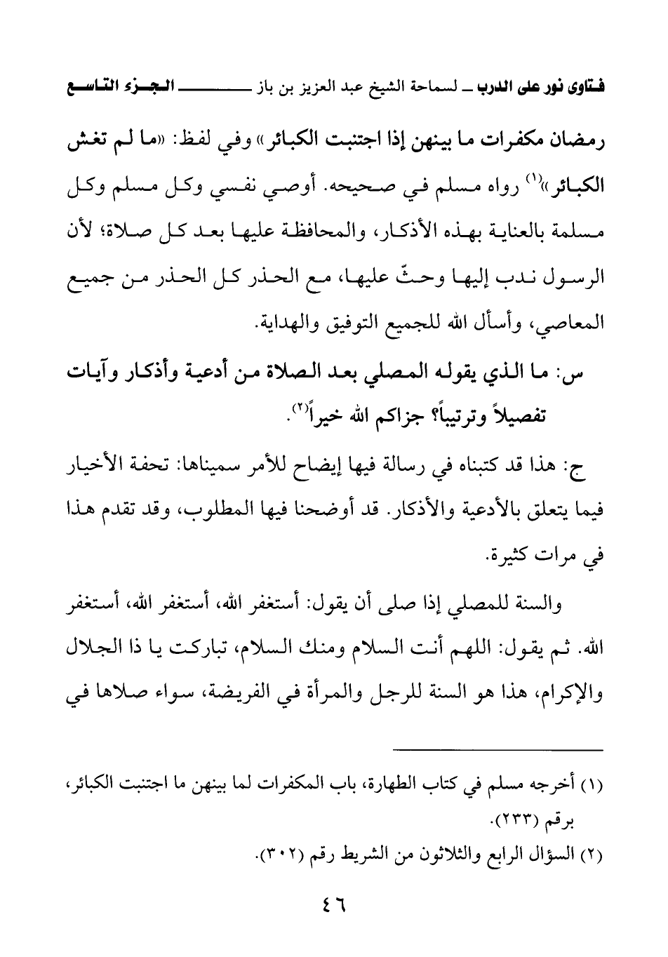 رمضان مكفرات ما بينهن إذا اجتنبت الكبائر) وفي لفظ: (ما لم تغش الكبائر (¬1)» رواه مسلم في صحيحه. أوصي نفسي وكل مسلم وكل مسلمة بالعناية بهذه الأذكار، والمحافظة عليها بعد كل صلاة؛ لأن الرسول ندب إليها وحث عليها، مع الحذر كل الحذر من جميع المعاصي، وأسأل الله للجميع التوفيق والهداية.