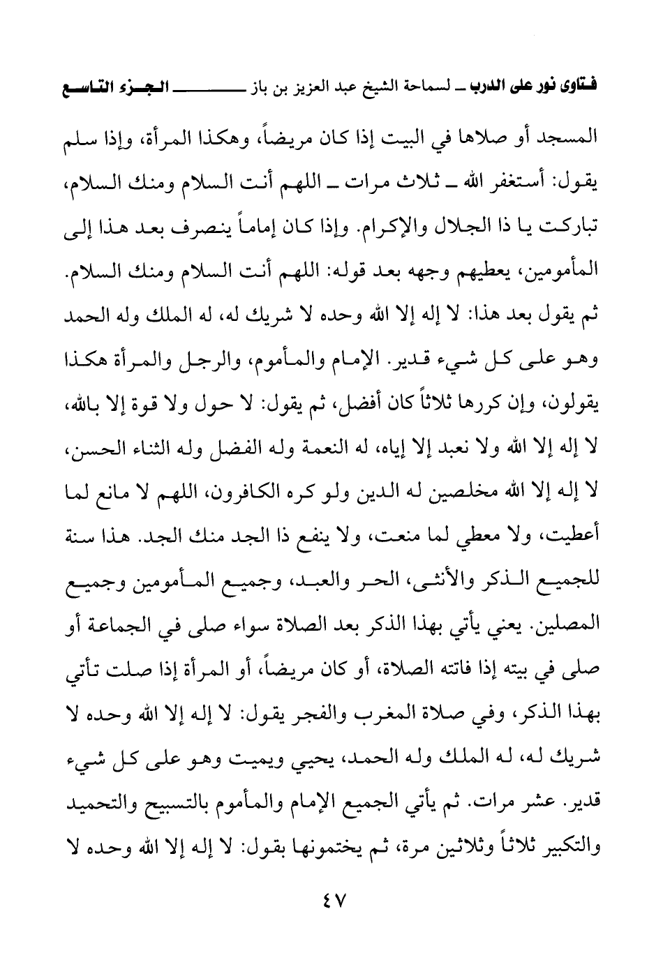 المسجد أو صلاها في البيت إذا كان مريضا، وهكذا المرأة، وإذا سلم يقول: أستغفر الله – ثلاث مرات – اللهم أنت السلام ومنك السلام، تباركت يا ذا الجلال والإكرام. وإذا كان إماما ينصرف بعد هذا إلى المأمومين، يعطيهم وجهه بعد قوله: اللهم أنت السلام ومنك السلام. ثم يقول بعد هذا: لا إله إلا الله وحده لا شريك له، له الملك وله الحمد وهو على كل شيء قدير. الإمام والمأموم، والرجل والمرأة هكذا يقولون، وإن كررها ثلاثا كان أفضل، ثم يقول: لا حول ولا قوة إلا بالله، لا إله إلا الله ولا نعبد إلا إياه، له النعمة وله الفضل وله الثناء الحسن، لا إله إلا الله مخلصين له الدين ولو كره الكافرون، اللهم لا مانع لما أعطيت، ولا معطي لما منعت، ولا ينفع ذا الجد منك الجد. هذا سنة للجميع الذكر والأنثى، الحر والعبد، وجميع المأمومين وجميع المصلين. يعني يأتي بهذا الذكر بعد الصلاة سواء صلى في الجماعة أو صلى في بيته إذا فاتته الصلاة، أو كان مريضا، أو المرأة إذا صلت تأتي بهذا الذكر، وفي صلاة المغرب والفجر يقول: لا إله إلا الله وحده لا شريك له، له الملك وله الحمد، يحيي ويميت وهو على كل شيء قدير. عشر مرات. ثم يأتي الجميع الإمام والمأموم بالتسبيح والتحميد والتكبير ثلاثا وثلاثين مرة، ثم يختمونها بقول: لا إله إلا الله وحده لا
