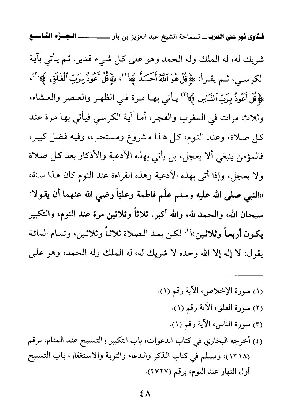 شريك له، له الملك وله الحمد وهو على كل شيء قدير. ثم يأتي بآية الكرسي، ثم يقرأ: {قُلْ هُوَ اللَّهُ أَحَدٌ} (¬1)، {قُلْ أَعُوذُ بِرَبِّ الْفَلَقِ} (¬2)، {قُلْ أَعُوذُ بِرَبِّ النَّاسِ} (¬3) يأتي بها مرة في الظهر والعصر والعشاء، وثلاث مرات في المغرب والفجر، أما آية الكرسي فيأتي بها مرة عند كل صلاة، وعند النوم، كل هذا مشروع ومستحب، وفيه فضل كبير، فالمؤمن ينبغي ألا يعجل، بل يأتي بهذه الأدعية والأذكار بعد كل صلاة ولا يعجل، وإذا أتى بهذه الأدعية وهذه القراءة عند النوم كان هذا سنة، «النبي صلى الله عليه وسلم علم فاطمة وعليا رضي الله عنهما أن يقولا: سبحان الله، والحمد لله، والله أكبر. ثلاثا وثلاثين مرة عند النوم، والتكبير يكون أربعا وثلاثين (¬4)» لكن بعد الصلاة ثلاثا وثلاثين، وتمام المائة يقول: لا إله إلا الله وحده لا شريك له، له الملك وله الحمد، وهو على