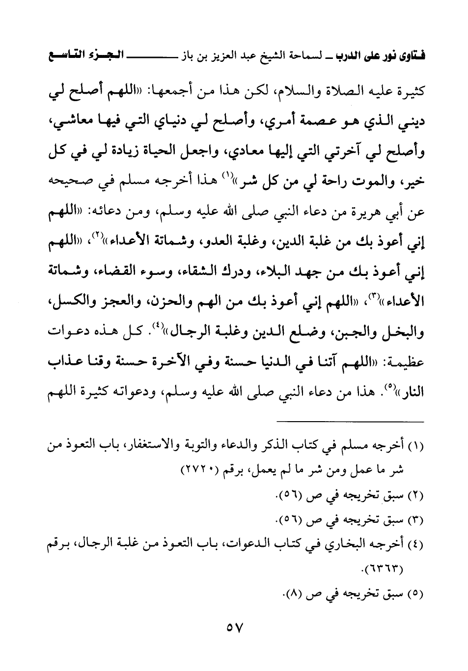 كثيرة عليه الصلاة والسلام، لكن هذا من أجمعها: «اللهم أصلح لي ديني الذي هو عصمة أمري، وأصلح لي دنياي التي فيها معاشي، وأصلح لي آخرتي التي إليها معادي، واجعل الحياة زيادة لي في كل خير، والموت راحة لي من كل شر (¬1)» هذا أخرجه مسلم في صحيحة عن أبي هريرة من دعاء النبي صلى الله عليه وسلم، ومن دعائه: «اللهم إني أعوذ بك من غلبة الدين، وغلبة العدو، وشماتة الأعداء (¬2)» «اللهم إني أعوذ بك من جهد البلاء، ودرك الشقاء، وسوء القضاء، وشماتة الأعداء (¬3)» «اللهم إني أعوذ بك من الهم والحزن، والعجز والكسل، والبخل والجبن، وضلع الدين وغلبة الرجال (¬4)» كل هذه دعوات عظيمة: «اللهم آتنا في الدنيا حسنة وفي الآخرة حسنة وقنا عذاب النار (¬5)» هذا من دعاء النبي صلى الله عليه وسلم، ودعواته كثيرة اللهم