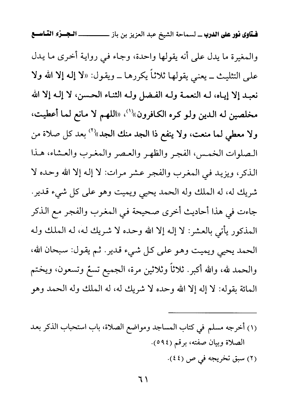 والمغيرة ما يدل على أنه يقولها واحدة، وجاء في رواية أخرى ما يدل على التثليث – يعنى يقولها ثلاثا يكررها – ويقول: «لا إله إلا الله ولا نعبد إلا إياه، له النعمة وله الفضل وله الثناء الحسن، لا إله إلا الله مخلصين له الدين ولو كره الكافرون (¬1)» «الهم لا مانع لم أعطيت، ولا معطي لما منعت، ولا ينفع ذا الجد منك الجد (¬2)» بعد كل صلاة من الصلوات الخمس، الفجر والظهر والعصر والمغرب والعشاء، هذا الذكر، ويزيد في المغرب والفجر عشر مرات: لا إله إلا الله وحده لا شريك له، له الملك وله الحمد يحيي ويميت وهو على كل شيء قدير. جاءت في هذا أحاديث أخرى صحيحة في المغرب والفجر مع الذكر المذكور يأتي بالعشر: لا إله إلا الله وحده لا شريك له، له الملك وله الحمد يحيي ويميت وهو على كل شيء قدير. ثم يقول: سبحان الله، والحمد لله، والله أكبر. ثلاثا وثلاثين مرة، الجميع تسع وتسعون، ويختم المائة بقوله: لا إله إلا الله وحده لا شريك له، له الملك وله الحمد وهو