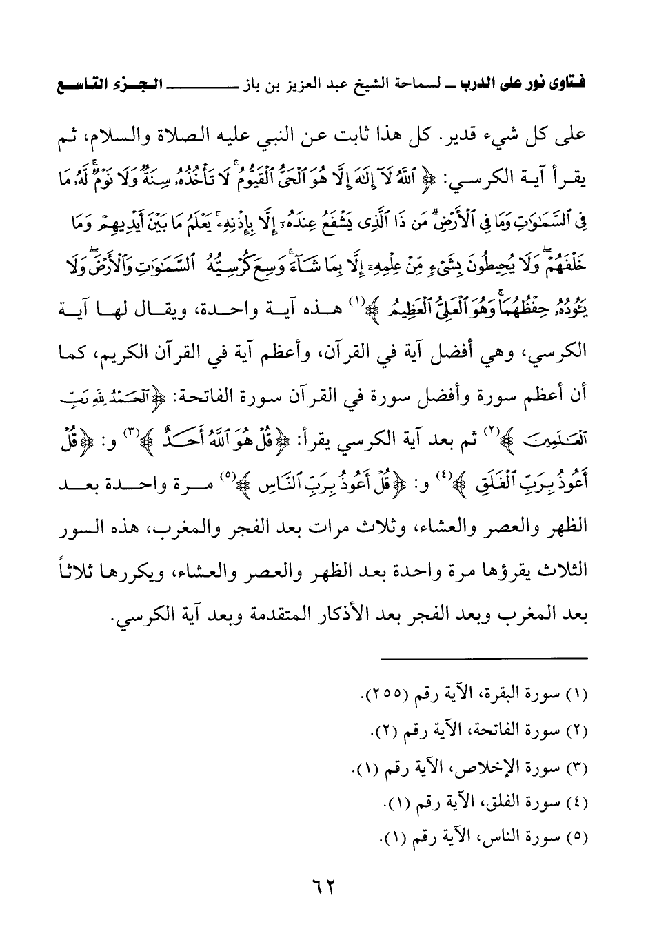 على كل شيء قدير. كل هذا ثابت عن النبي عليه الصلاة والسلام، ثم يقرأ آية الكرسي: {اللَّهُ لَا إِلَهَ إِلَّا هُوَ الْحَيُّ الْقَيُّومُ لَا تَأْخُذُهُ سِنَةٌ وَلَا نَوْمٌ لَهُ مَا فِي السَّمَاوَاتِ وَمَا فِي الْأَرْضِ مَنْ ذَا الَّذِي يَشْفَعُ عِنْدَهُ إِلَّا بِإِذْنِهِ يَعْلَمُ مَا بَيْنَ أَيْدِيهِمْ وَمَا خَلْفَهُمْ وَلَا يُحِيطُونَ بِشَيْءٍ مِنْ عِلْمِهِ إِلَّا بِمَا شَاءَ وَسِعَ كُرْسِيُّهُ السَّمَاوَاتِ وَالْأَرْضَ وَلَا يَئُودُهُ حِفْظُهُمَا وَهُوَ الْعَلِيُّ الْعَظِيمُ} (¬1) هذه آية واحدة، ويقال لها آية الكرسي، وهي أفضل آية في القرآن، وأعظم آية في القرآن الكريم، كما أن أعظم سورة وأفضل سورة في القرآن سورة الفاتحة: {الْحَمْدُ لِلَّهِ رَبِّ الْعَالَمِينَ} (¬2) ثم بعد آية الكرسي يقرأ: {قُلْ هُوَ اللَّهُ أَحَدٌ} (¬3) و: {قُلْ أَعُوذُ بِرَبِّ الْفَلَقِ} (¬4) و: {قُلْ أَعُوذُ بِرَبِّ النَّاسِ} (¬5) مرة واحدة بعد الظهر والعصر والعشاء، وثلاث مرات بعد الفجر والمغرب، هذه السور الثلاث يقرؤها مرة واحدة بعد الظهر والعصر والعشاء، ويكررها ثلاثا بعد المغرب وبعد الفجر بعد الأذكار المتقدمة وبعد آية الكرسي.