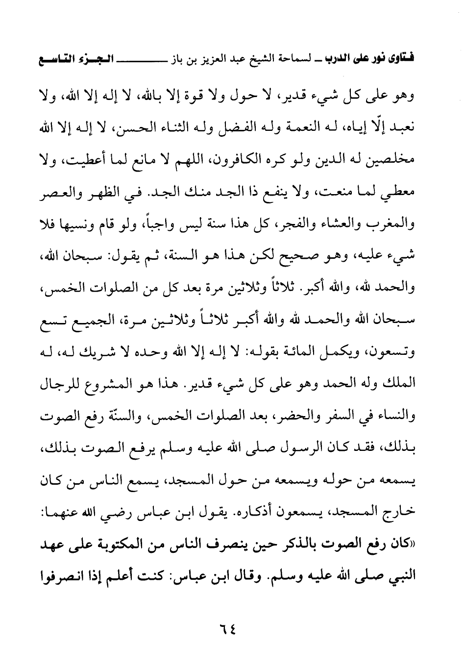 وهو على كل شيء قدير، لا حول ولا قوة إلا بالله، لا إله إلا الله، ولا نعبد إلا إياه، له النعمة وله الفضل وله الثناء الحسن، لا إله إلا الله مخلصين له الدين ولو كره الكافرون، اللهم لا مانع لما أعطيت، ولا معطي لما منعت، ولا ينفع ذا الجد منك الجد. في الظهر والعصر والمغرب والعشاء والفجر، كل هذا سنة ليس واجبا، ولو قام ونسيها فلا شيء عليه وهو صحيح لكن هذا هو السنة، ثم يقول: سبحان الله، والحمد لله، والله أكبر. ثلاثا وثلاثين مرة بعد كل من الصلوات الخمس، سبحان الله والحمد لله والله أكبر ثلاثا وثلاثين مرة، الجميع تسع وتسعون، ويكمل المائة بقوله: لا إله إلا الله وحده لا شريك له، له الملك وله الحمد وهو على كل شيء قدير. هذا هو المشروع للرجال والنساء في السفر والحضر، بعد الصلوات الخمس، والسنة رفع الصوت بذلك، فقد كان الرسول صلى الله عليه وسلم يرفع الصوت بذلك، يسمعه من حوله ويسمعه من حول المسجد، يسمع الناس من كان خارج المسجد، يسمعون أذكاره. يقول ابن عباس رضي الله عنهما: «كان رفع الصوت بالذكر حين ينصرف الناس من المكتوبة على عهد النبي صلى الله عليه وسلم. وقال ابن عباس: كنت أعلم إذا انصرفوا
