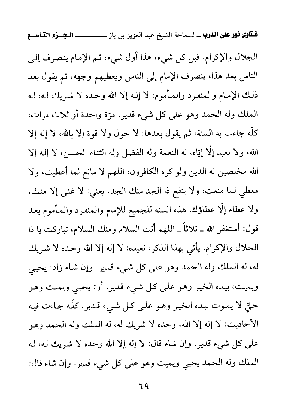 الجلال والإكرام. قبل كل شيء، هذا أول شيء، ثم الإمام ينصرف إلى الناس بعد هذا، ينصرف الإمام إلى الناس ويعطيهم وجهه، ثم يقول بعد ذلك الإمام والمنفرد والمأموم: لا إله إلا الله وحده لا شريك له، له الملك وله الحمد وهو على كل شيء قدير. مرة واحدة أو ثلاث مرات، كله جاءت به السنة، ثم يقول بعدها: لا حول ولا قوة إلا بالله، لا إله إلا الله، ولا نعبد إلا إياه، له النعمة وله الفضل وله الثناء الحسن، لا إله إلا الله مخلصين له الدين ولو كره الكافرون، اللهم لا مانع لما أعطيت، ولا معطي لما منعت، ولا ينفع ذا الجد منك الجد. يعني: لا غنى إلا منك، ولا عطاء إلا عطاؤك. هذه السنة للجميع للإمام والمنفرد والمأموم بعد قول: أستغفر الله – ثلاثا – اللهم أنت السلام ومنك السلام، تباركت يا ذا الجلال والإكرام. يأتي بهذا الذكر، نعيده: لا إله إلا الله وحده لا شريك له، له الملك وله الحمد وهو على كل شيء قدير. وإن شاء زاد: يحيي ويميت، بيده الخير وهو على كل شيء قدير. أو: يحيي ويميت وهو حي لا يموت بيده الخير وهو على كل شيء قدير. كله جاءت فيه الأحاديث: لا إله إلا الله، وحده لا شريك له، له الملك وله الحمد وهو على كل شيء قدير. وإن شاء قال: لا إله إلا الله وحده لا شريك له، له الملك وله الحمد يحيي ويميت وهو على كل شيء قدير. وإن شاء قال: