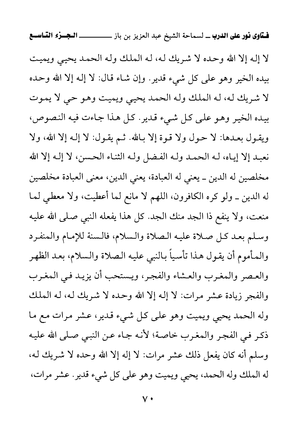 لا إله إلا الله وحده لا شريك له، له الملك وله الحمد يحيي ويميت بيده الخير وهو على كل شيء قدير. وإن شاء قال: لا إله إلا الله وحده لا شريك له، له الملك وله الحمد يحيي ويميت وهو حي لا يموت بيده الخير وهو على كل شيء قدير. كل هذا جاءت فيه النصوص، ويقول بعدها: لا حول ولا قوة إلا بالله. ثم يقول: لا إله إلا الله، ولا نعبد إلا إياه، له الحمد وله الفضل وله الثناء الحسن، لا إله إلا الله مخلصين له الدين – يعنى له العبادة، يعنى الدين، معنى العبادة مخلصين له الدين – ولو كره الكافرون، اللهم لا مانع لما أعطيت، ولا معطي لما منعت، ولا ينفع ذا الجد منك الجد. كل هذا يفعله النبي صلى الله عليه وسلم بعد كل صلاة عليه الصلاة والسلام، فالسنة للإمام والمنفرد والمأموم أن يقول هذا تأسيا بالنبي عليه الصلاة والسلام، بعد الظهر والعصر والمغرب والعشاء والفجر، ويستحب أن يزيد في المغرب والفجر زيادة عشر مرات: لا إله إلا الله وحده لا شريك له، له الملك وله الحمد يحيي ويميت وهو على كل شيء قدير، عشر مرات مع ما ذكر في الفجر والمغرب خاصة؛ لأنه جاء عن النبي صلى الله عليه وسلم أنه كان يفعل ذلك عشر مرات: لا إله إلا الله وحده لا شريك له، له الملك وله الحمد، يحيي ويميت وهو على كل شيء قدير. عشر مرات