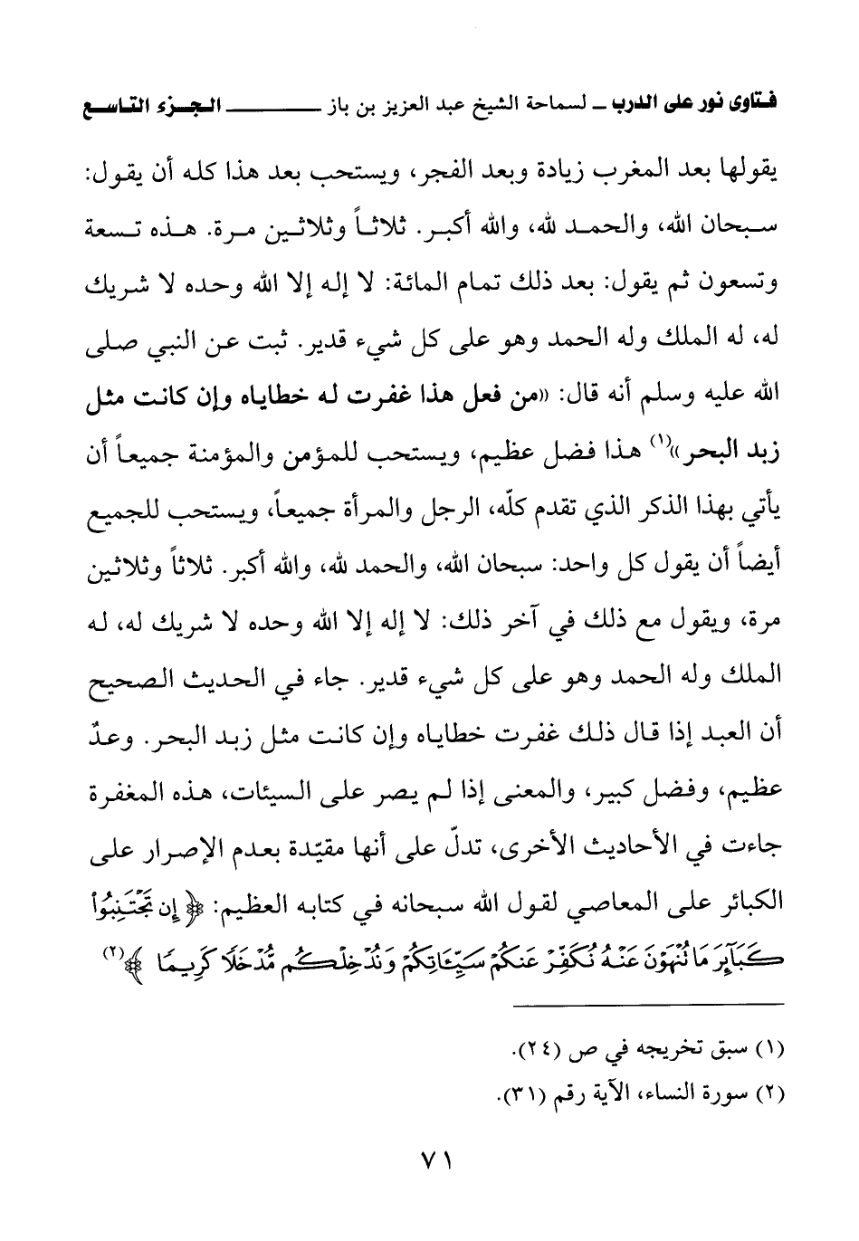 يقولها بعد المغرب زيادة وبعد الفجر، ويستحب بعد هذا كله أن يقول: سبحان الله، والحمد لله، والله أكبر. ثلاثا وثلاثين مرة. هذه تسعة وتسعون ثم يقول: بعد ذلك تمام المائة: لا إله إلا الله وحده لا شريك له، له الملك وله الحمد وهو على كل شيء قدير. ثبت عن النبي صلى الله عليه وسلم أنه قال: «من فعل هذا غفرت له خطاياه وإن كانت مثل زبد البحر (¬1)» هذا فضل عظيم، ويستحب للمؤمن والمؤمنة جميعا أن يأتي بهذا الذكر الذي تقدم كله، الرجل والمرأة جميعا، ويستحب للجميع أيضا أن يقول كل واحد: سبحان الله، والحمد لله، والله أكبر. ثلاثا وثلاثين مرة، ويقول مع ذلك في آخر ذلك: لا إله إلا الله وحده لا شريك له، له الملك وله الحمد وهو على كل شيء قدير. جاء في الحديث الصحيح أن العبد إذا قال ذلك غفرت خطاياه وإن كانت مثل زبد البحر. وعد عظيم، وفضل كبير، والمعنى إذا لم يصر على السيئات، هذه المغفرة جاءت في الأحاديث الأخرى، تدل على أنها مقيدة بعدم الإصرار على الكبائر على المعاصي لقول الله سبحانه في كتابه العظيم: {إِنْ تَجْتَنِبُوا كَبَائِرَ مَا تُنْهَوْنَ عَنْهُ نُكَفِّرْ عَنْكُمْ سَيِّئَاتِكُمْ وَنُدْخِلْكُمْ مُدْخَلًا كَرِيمًا} (¬2)
