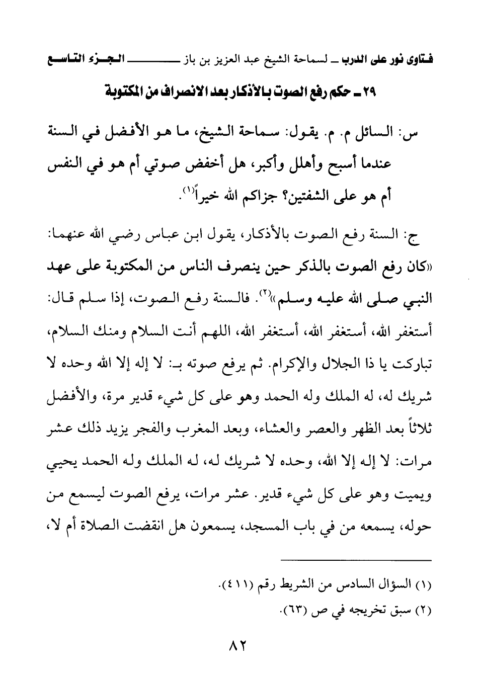 ج: السنة رفع الصوت بالأذكار، يقول ابن عباس رضي الله عنهما: «كان رفع الصوت بالذكر حين ينصرف الناس من المكتوبة على عهد النبي صلى الله عليه وسلم (¬2)» فالسنة رفع الصوت، إذا سلم قال: أستغفر الله، أستغفر الله، أستغفر الله، اللهم أنت السلام ومنك السلام، تباركت يا ذا الجلال والإكرام. ثم يرفع صوته بـ: لا إله إلا الله وحده لا شريك له، له الملك وله الحمد وهو على كل شيء قدير، مرة، والأفضل ثلاثا بعد الظهر والعصر والعشاء، وبعد المغرب والفجر يزيد ذلك عشر مرات: لا إله إلا الله، وحده لا شريك له، له الملك وله الحمد يحيي ويميت وهو على كل شيء قدير. عشر مرات، يرفع الصوت ليسمع من حوله، يسمعه من في باب المسجد، يسمعون هل انقضت الصلاة أم لا،
